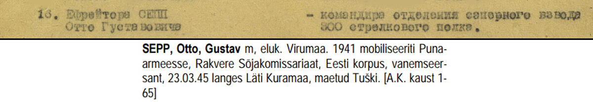7. laskurdiviisi 300. laskurpolgu üksiku sapöörijao komandör, jefreitor Otto Sepp sai 1943. aasta jaanuaris Velikije Luki lahingute eest Punatähe ordeni ja kohe peale seda ka Vapruse medali. Medal on tuttavast 186 XXX vahemikust, Punatähe number 113 590 - autasustamislehtedelt tehtud tõlked on umbes täpselt sellised: