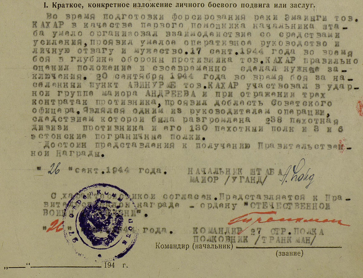 Autasustatuks oli 7. laskurdiviisi 27. laskurpolgu staabiülema 1. abi, kapten (hiljem major) Hendrik Kahar, kes lipniku auastme oli saanud juba Eesti Sõjakoolist 1938. aastal. Isamaasõja 2. järgu orden (126209) on antud 1944. aasta septembrilahingute eest - Emajõe forsseerimine ja Avinurme. Mõlemas lahingus olid sunnitud eestlased võitlema eestlaste vastu. Autasulehel on välja toodud muuhulgas, et kapten Kahar, olles Avinurme operatsiooni üks juhtidest aitas purustada vaenlase 238. jalaväediviisi ja 130. rügemendi (tegelikult oli tegemist 285. diviisi 113. julgestusrügemendiga) ja 3. ja 6. Eesti Piirikaitserügemendi.