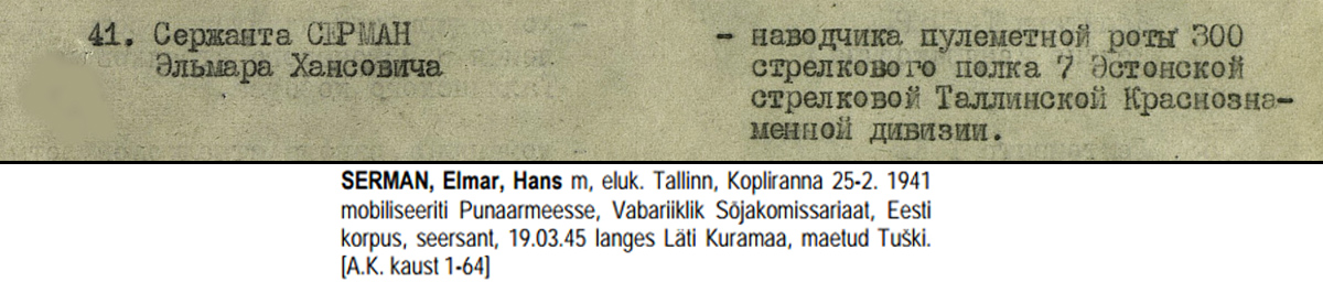 Väga huvitav autasustamine. Lähedase numbriga 2 kl- Isamaasõja orden on selles teemas Vassili Käärid, kes sai Hiiumaal raskelt haavata. Tema ordeni number on 416 742uscha kirjutas:7. Eesti laskurdiviisi 300. laskurpolgu kuulipilduri, seersant Elmar Serman'i Isamaasõja ordeni 2. järk (416 763).