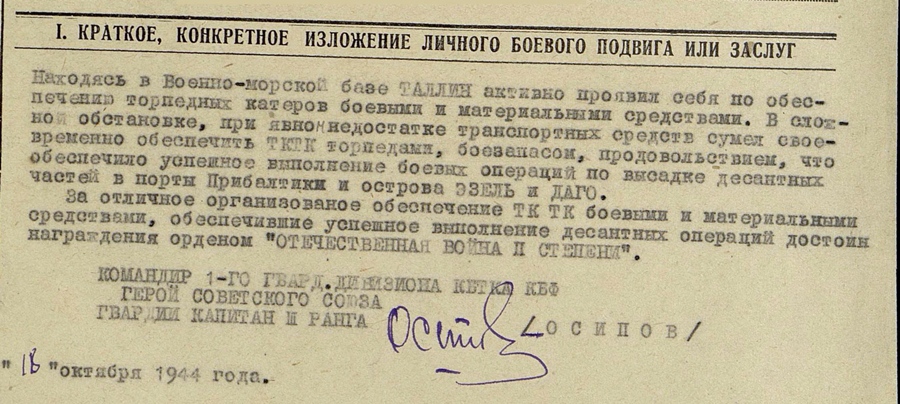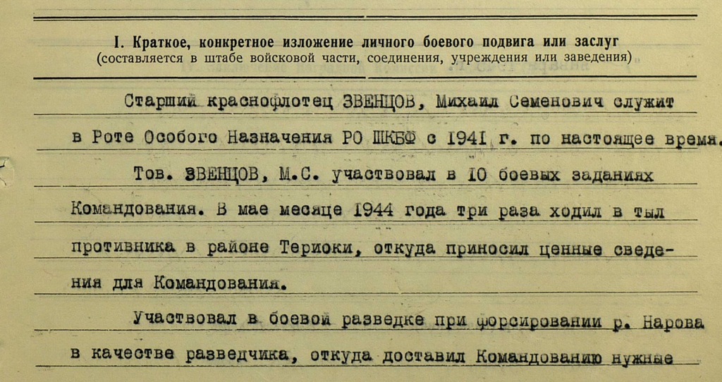 Kevadest 1942. kuni käesoleva ajani ( peetakse silmas 1943. aasta Oktoobrit ) osales ta spetsiaalsetes ja luureoperatsioonides Peterhof-Strelna rajoonis. Tugevate külmade ajal lamas ta mitu päeva eesliinil, jälgides vaenlase kaitserajatisi ja nende valvet, et saaks ette valmistada ja täita ülesande ’’keele’’ võtmiseks. Ülesanne täideti.