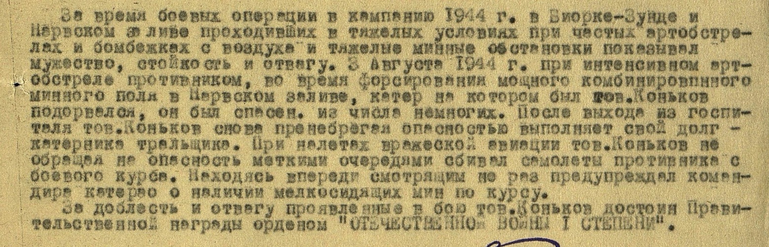 Кавалер ст. краснофлотец Коньков А.И., служил на катере тральщике в 1-вом Гв.Краснознам.дивизионе катеров тральщиков Талинский Морской Оборонительный район КБФ. , должность ком.пуль. зенитной установки на КТЩ - 704.