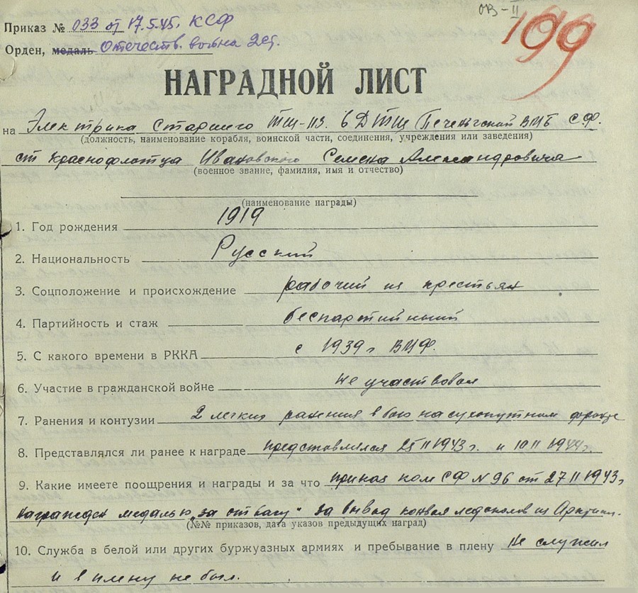 Pechenga sõjamereväebaasi traali ТЩ 113 vanemelektrik Semjon Ivanovski, alates Aprillist 1945. Isamaasõja ordeni II kl. nr. 392394 kavaler. Seekord tegemist küll Punalipulise Põhja laevastikuga, kuid kuna autasuleht on huvitav, siis panen üles.