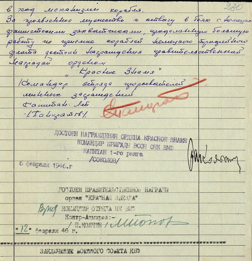 1945. aasta augustis laeval TSH-151, täitis eesrindlikult erinevaid ülesandeid ja parendas laeva seisukorda.