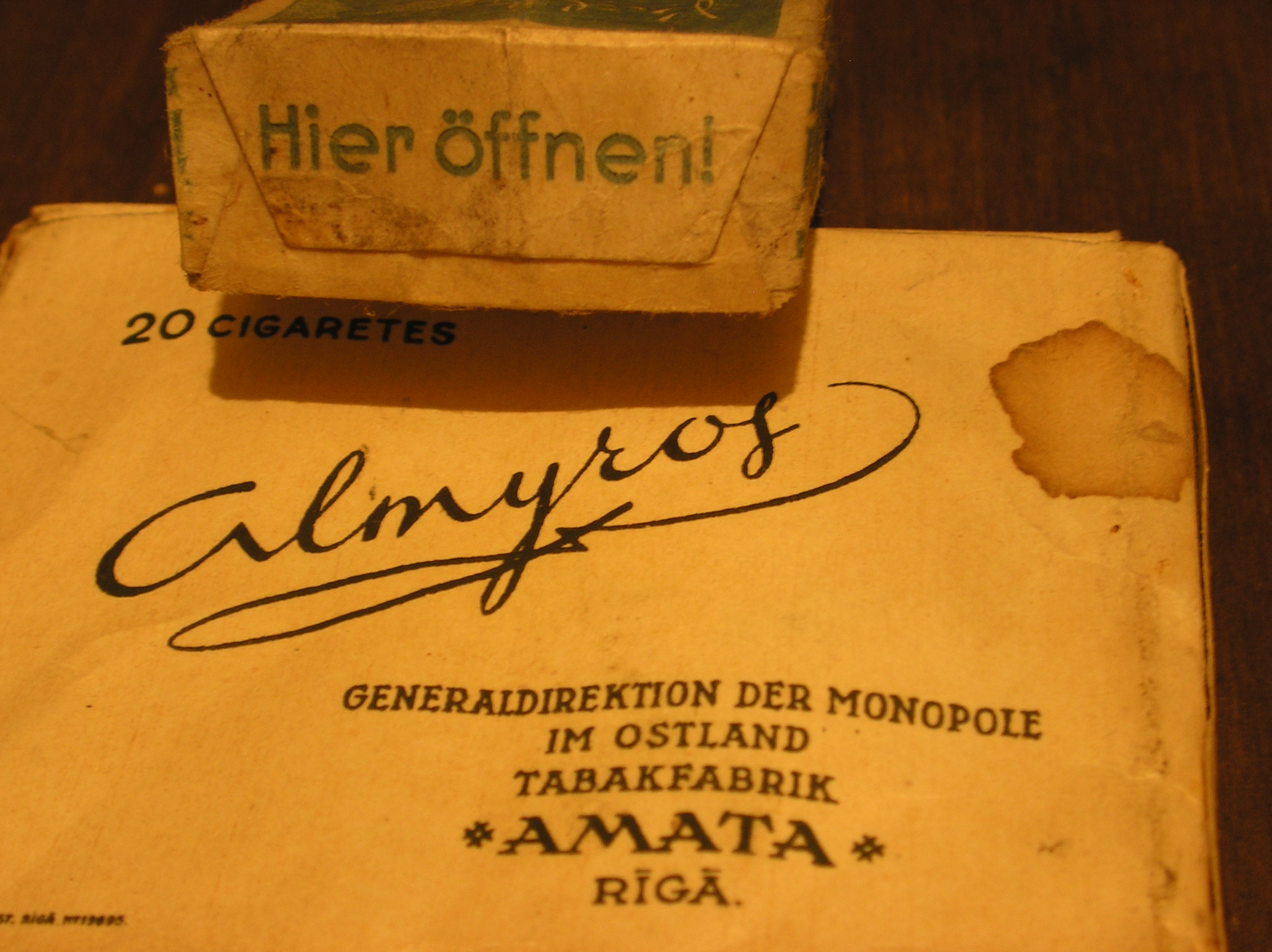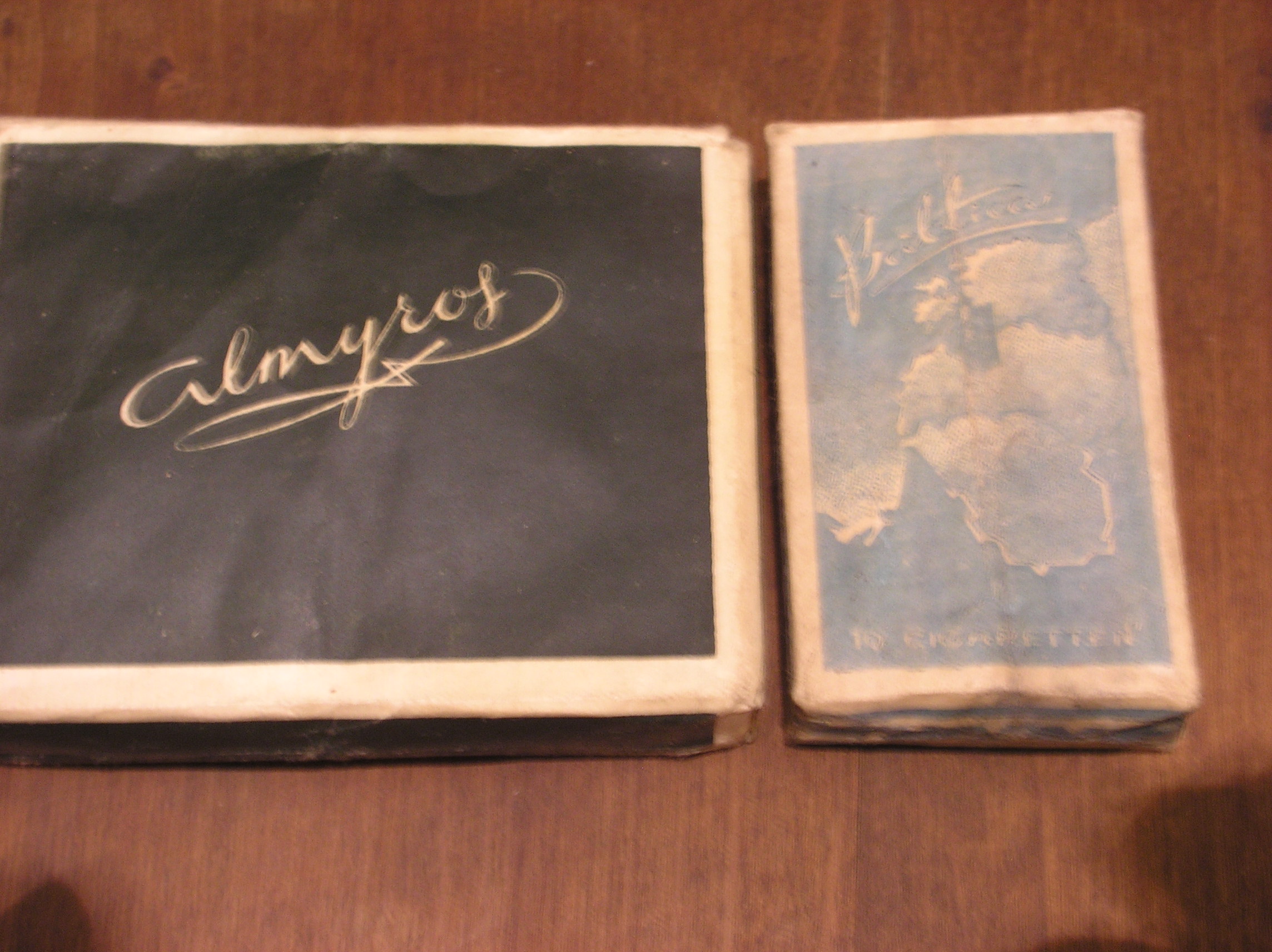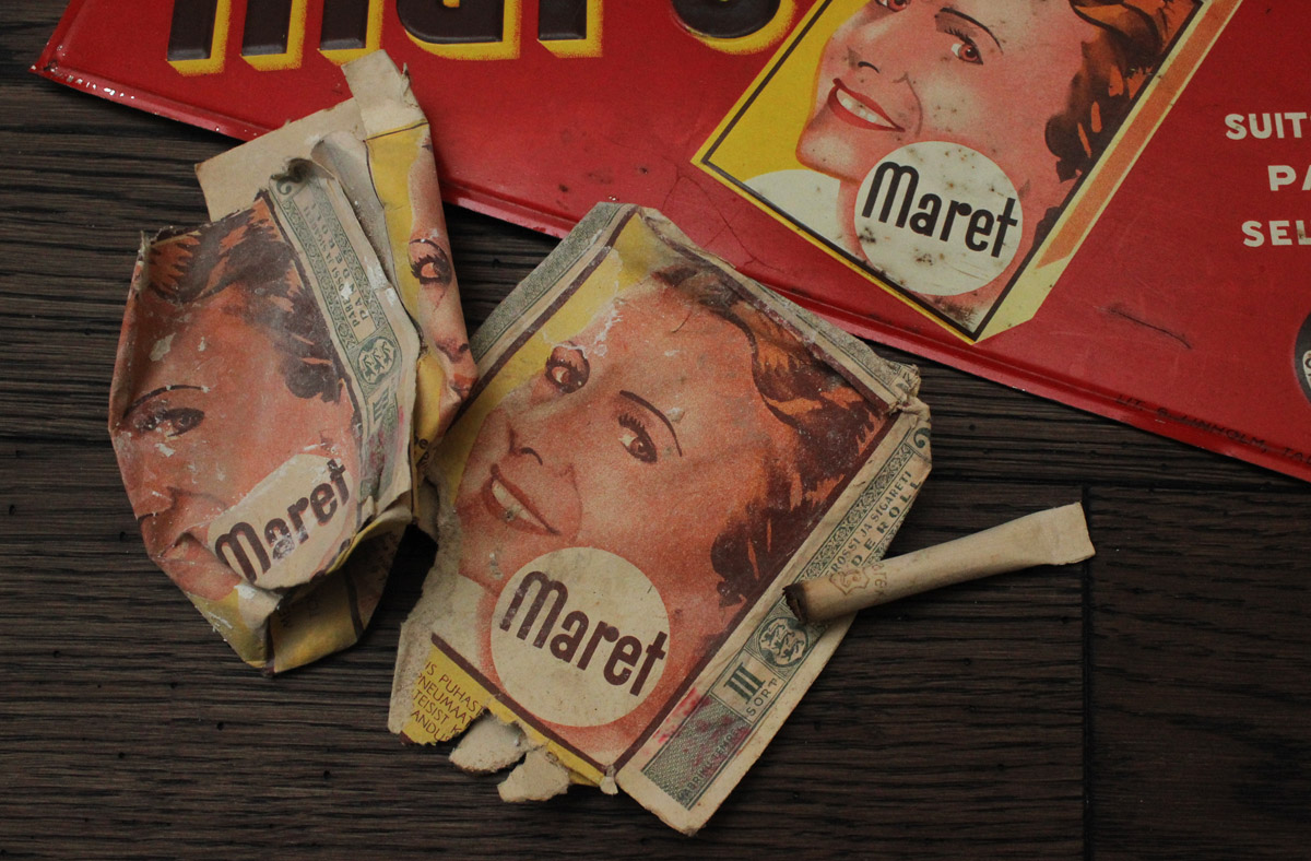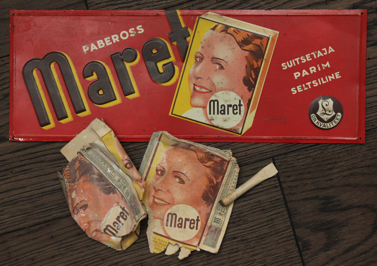 Ennesõjaaegne "Maret" paberosside plekist reklaamsilt ja paar äranässerdatud pakki ja üks koni 1939. aastast.