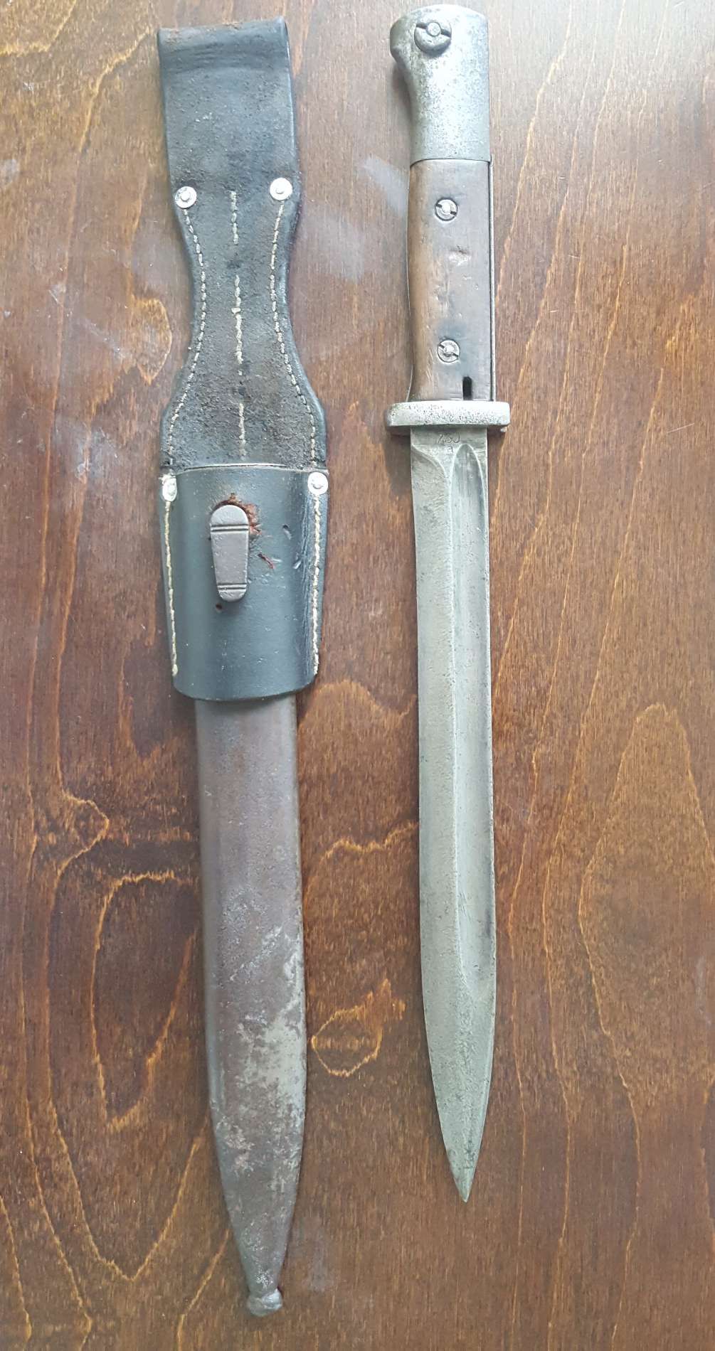 Vasakult alates: 1) Teritatud, nupu pea ning pealmine sälk maha käiatud, tupe roostes, bakeliidid ilusad 2) Muidu oleks ilus berdan, aga kinnitus on haihtunud 3) nahal puudu kinnitusrihm, tupe läikivaks hõõrutud nagu ka tera, põsed puust ja tunduvad originaalid, teritatud, numbrid klapivad 4) Teritatud, ilmselt vett ja külma saanud, bakeliit on kõveraks paisunud 5) rõvedalt teritatud, nupp kinni
