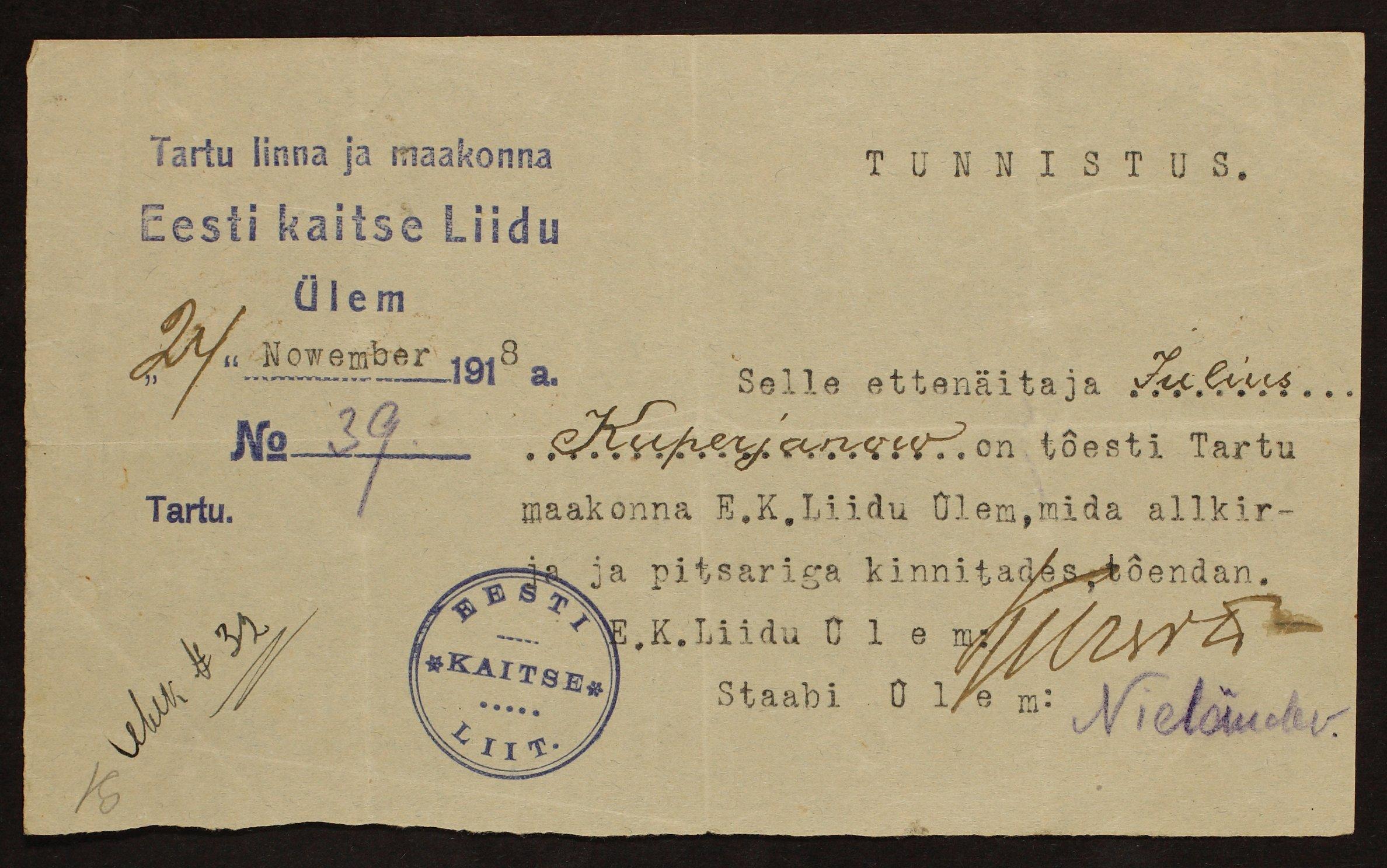 J. Kuperjanovi isiklikud dokumendid Vabadussõja sündmuste kohta ja elulookirjeldus ERA.2124.2.541; 20.10.1936