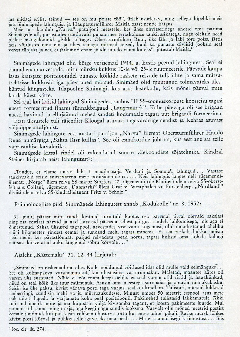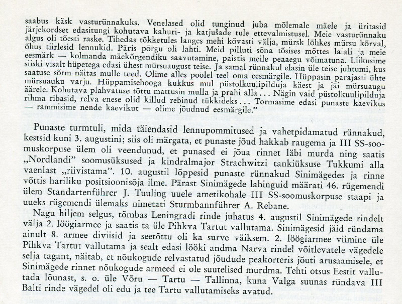 Teine oli alla kahekümnene poiss, kes igakord tulelöögi ajal jättis maha oma koha kaitsekraavi tulepesas ja hakkas varju otsima suuematest varjenditest, ise hüsteeriliselt karjudes: ”Ma saan pihta! Ma saan pihta!” Kuni ta ükskord leitigi surnult kompaniipunkri madalast jooksukraavist, mõni samm enne ukseava. Ei jõudnud kohale, aimus läks enne täide. Kuigi meie positsioon oli eesliinist mõnevõrra tagapool ja aktiivne lähivõitlus oma rünnakute ja vasturünnakutega enamasti siiani ei ulatunud, kandsime siiski peaaegu iga päev kaotusi. Üks valusamaid mulle isiklikult oli see, kui ühel hommikupoolikul pataljoni staapi minnes leidsin mäe küljel staabi sissepääsu lähedal langenuna oma sõbra ja klassivenna leitnant Arved Nõmme. Ta oli just äsja saanud mürsu- või miinikilluga raske kõhuhaava, surm oli ilmselt silmapilkne. Alles mõne päeva eest andis ta mulle oma ohvitserimütsi (kas ka see oli eelaimus?) ja vähem kui poolteist aastat tagasi olime istunud ühes koolipingis. Sõber Arved oli ka ainus ja viimane varasemast ajast tuttav poiss kogu Sinimägede lahingute ja edaspidiste sündmuste jooksul, kellega kokku juhtusin. Sellised asjad panevad isegi nooruki elu ja surma üle tõsiselt järele mõtlema. Hoolimata sellest et rindel on surm kohutavalt sage ja kohutavalt igapäevane asi, aga ikkagi…