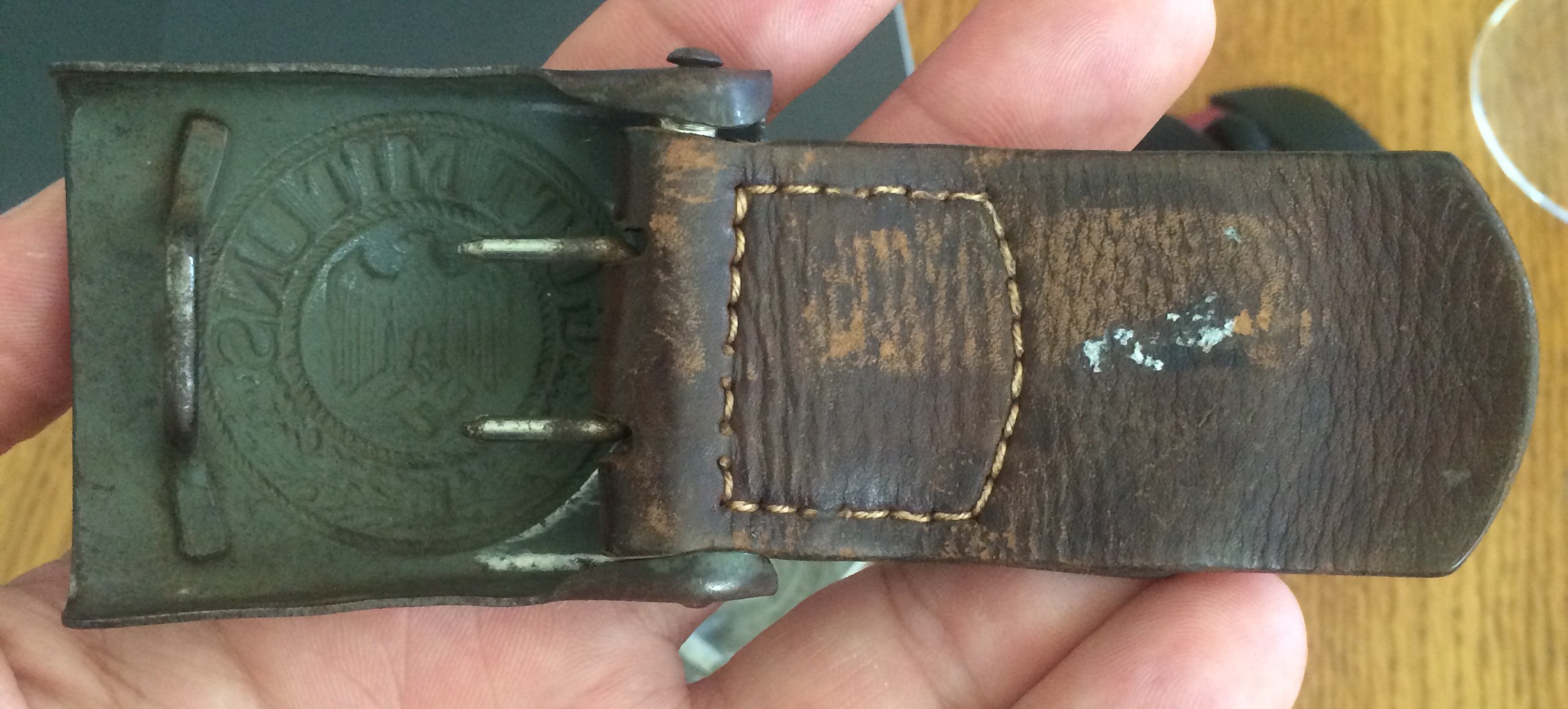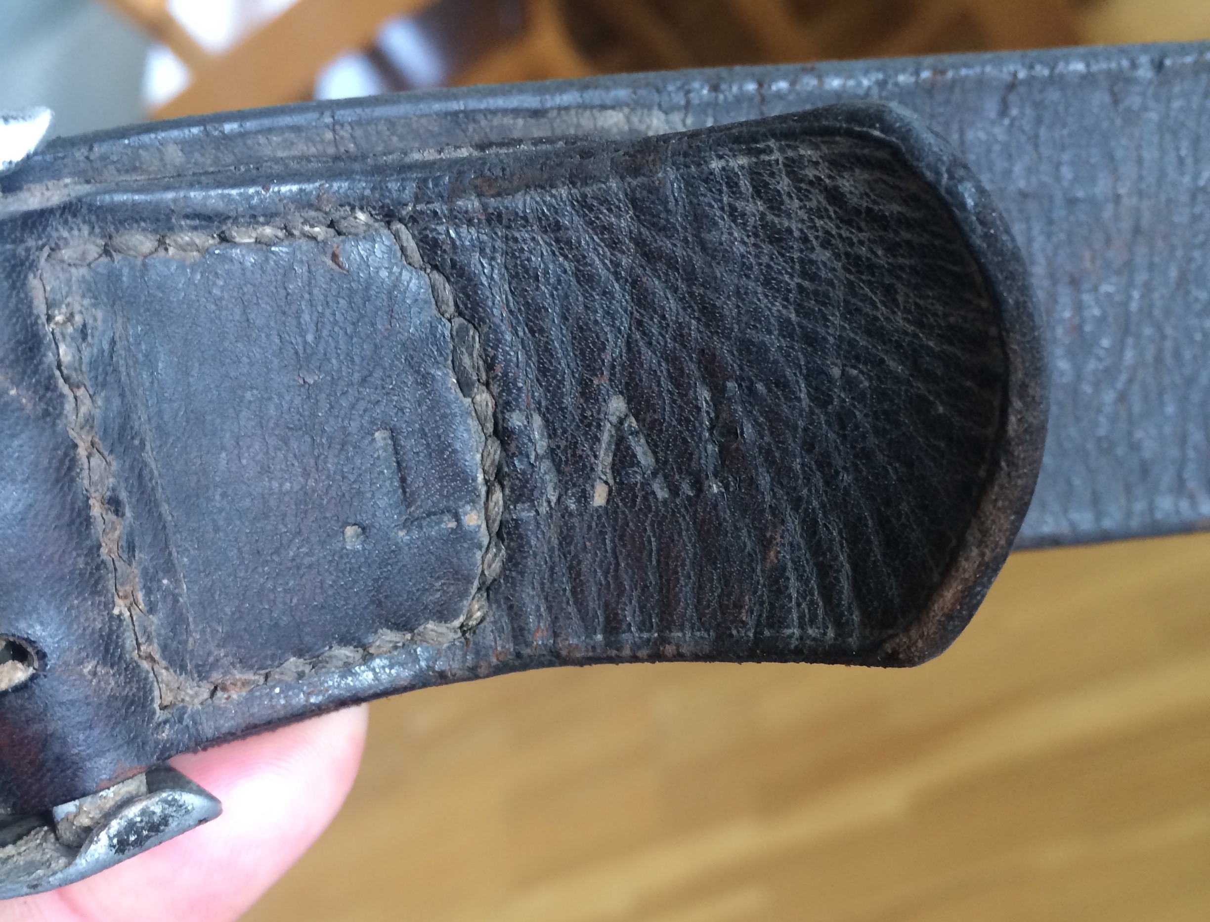 Esimese tüübi LW komplekt, nii nagu leitud omas mahlas. Rihm 110cm, õmblused mädad. Rihm kõva aga täiesti terve ja tundub, et saaks õige hooldusega elule tagasi. Pandla naha õmblused terved, LBA märgistusega ja 1936a markeering. Haruldane, 200.-
