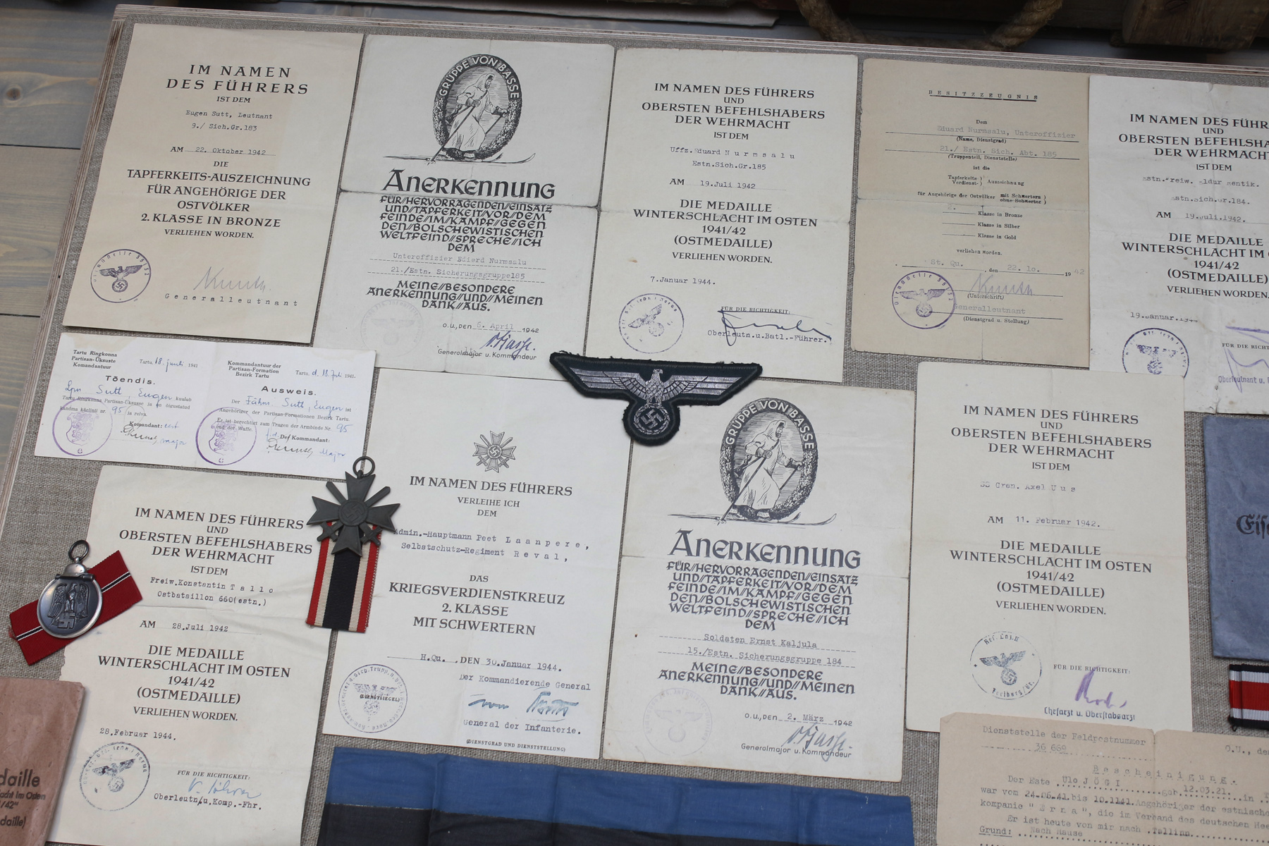 Sellel alusel on dokumendid valdavalt 1941/42 aastatest. Haruldased paberid on kindralmajor / kindralleitnant von Basse poolt eestlastele antud tänukirjad. Reavõitleja Ernst Kaljula, kelle paber on aluse keskel teenis Alfons Rebase poolt juhitud 184. julgestusgrupi 15. sadakonnas ja ta langes paar nädalat peale tänukirjaga autasustamist. Üleval nurgas on leitnant Eugen Sutt'i autasutunnistus ja selle all 1941. aasta juulis väljastatud tõend, et ta kuulub Tartu Ringkonna Partisanide Üksusesse. E.S. paberitest olen siin foorumis varem juba heietanud - üks huvitavamaid dokumentide komplekte, mis mul on siiani kätte juhtunud.