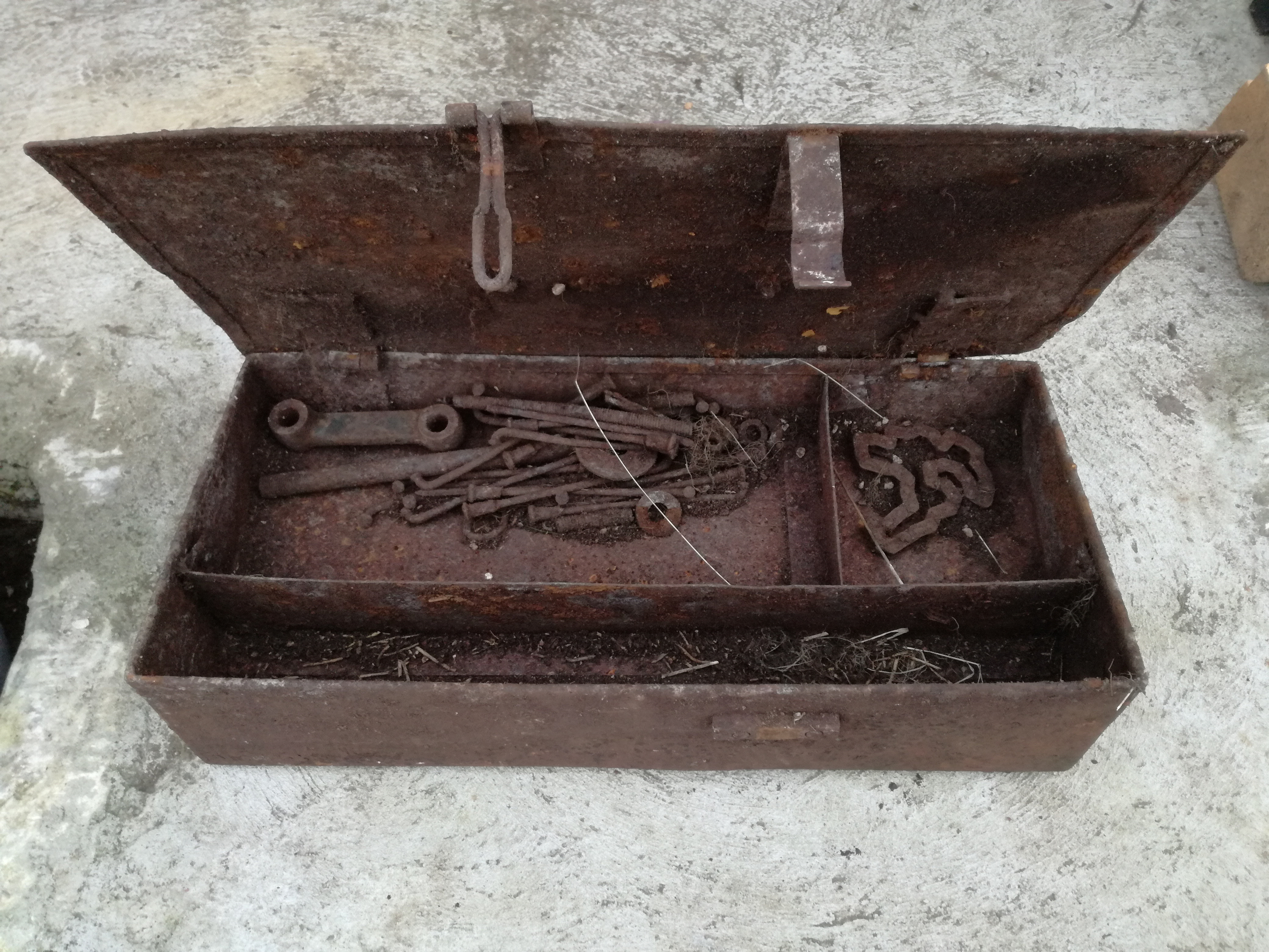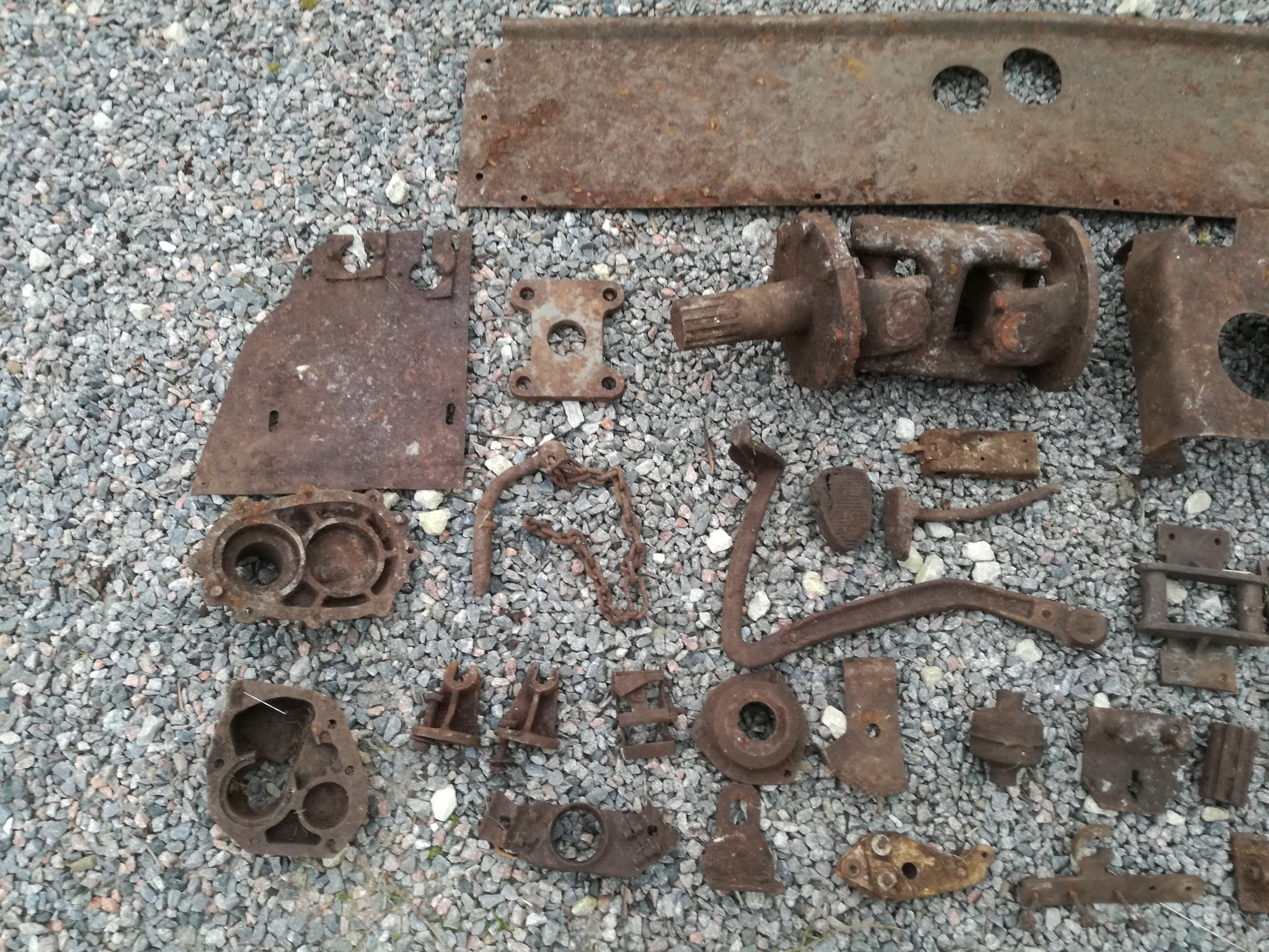 Kast ise kindlasti tsikli varustusse pole kuulunud. Aga 2 avaga jupstükk tundub olema küll olema rööpkulik-vedrustusega tsikli esihargi detail, vb NSU, aga sellised olid paljudel markidel, kett võiks olla tsikli generaatori käitamiseks, jällegi NSU OSL mudelitel oli sarnane, pikk pulk on vb esihargi detail jällegi, pildilt ei saa aru.