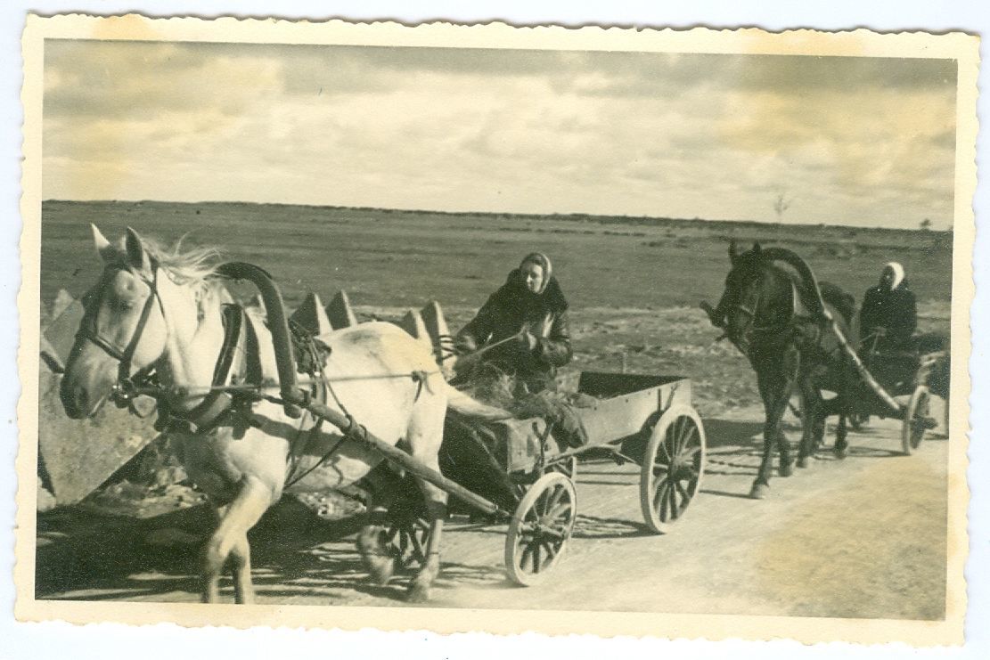 Ei naised ega vankrid paelu tähelepanu, vaid see koht kus nad asuvad.Kas äkki Sõrves Lõpe-Kaimri liini alal.Seal on sellised püramiidid tee ääres.Kuna foto on endisel EW aegsel paksul paberil, võib oletada et 1941 aasta ülesvõte.