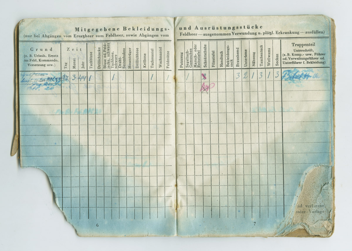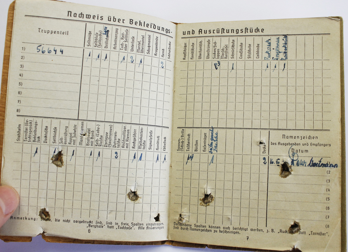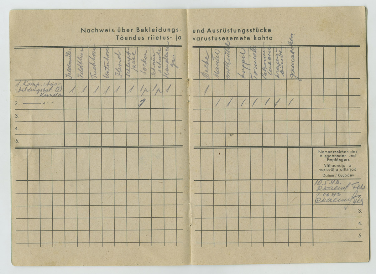 Sarnaselt Soldbuch'iga on sisse kantud omaniku andmed ja nimekiri välja antud varustuse kohta.