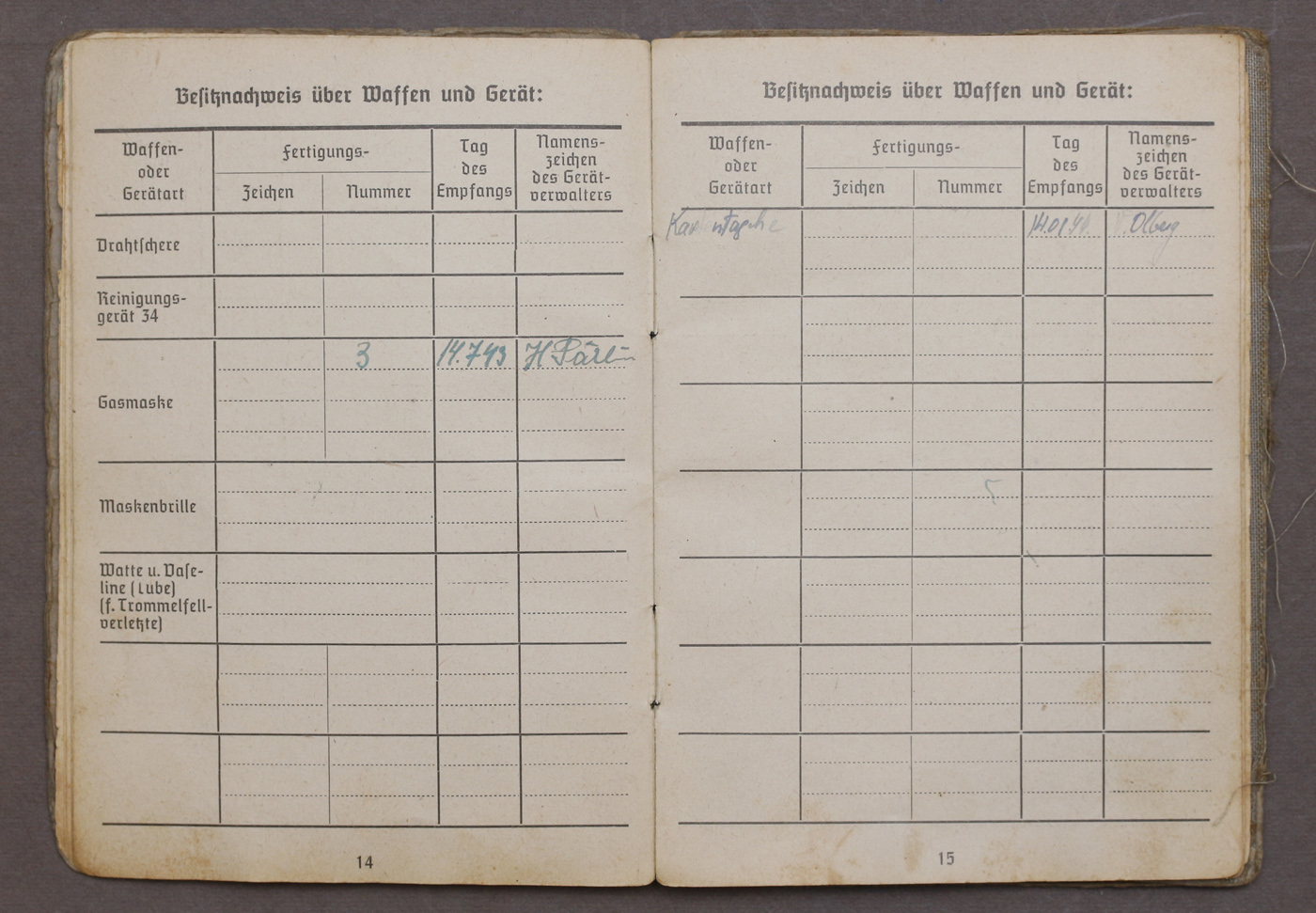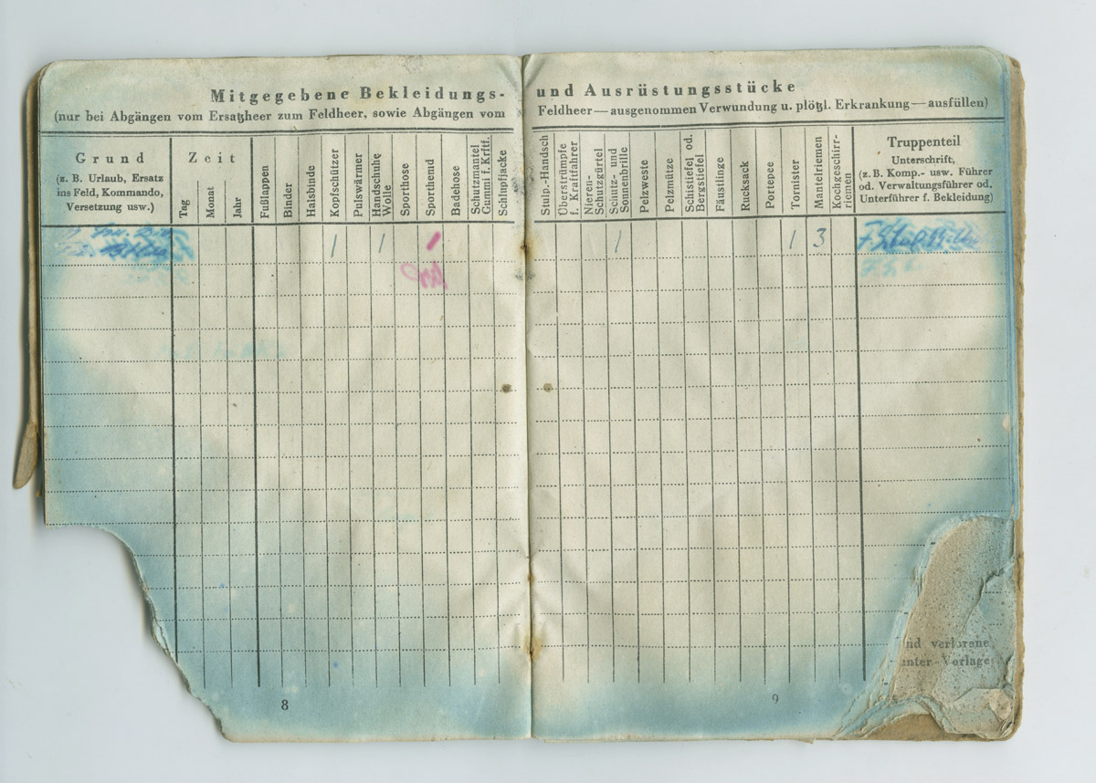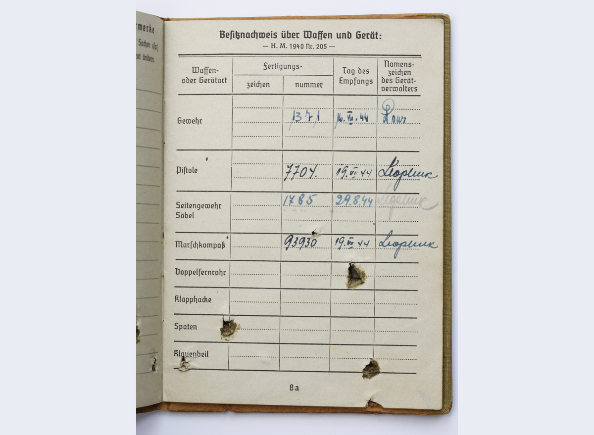 Sarnaselt Soldbuch'iga on sisse kantud omaniku andmed ja nimekiri välja antud varustuse kohta.