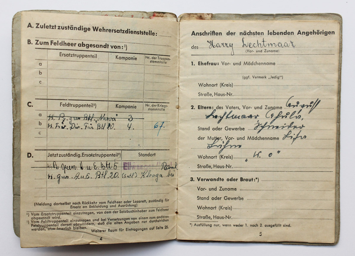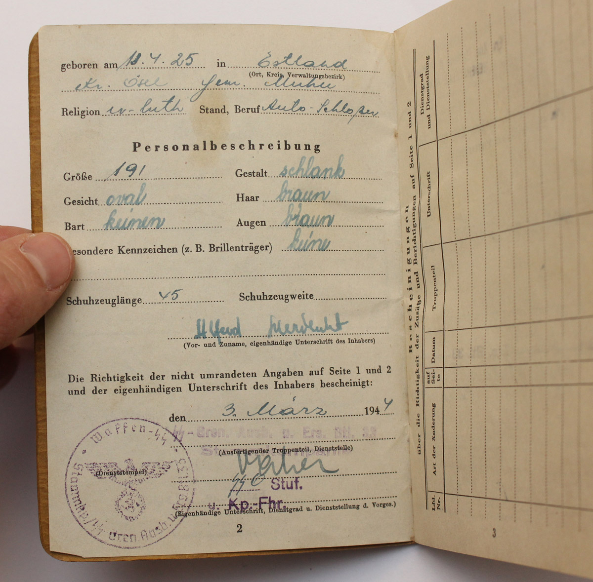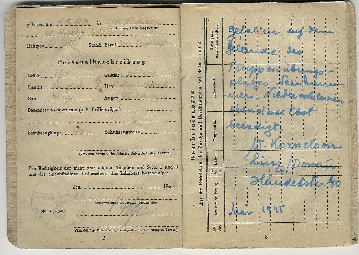 Nooremleitnant Evo Meere soldbuch. Langes 1945. a mais Neuhammeris. Soldbuch kuskil välismaa kogus.