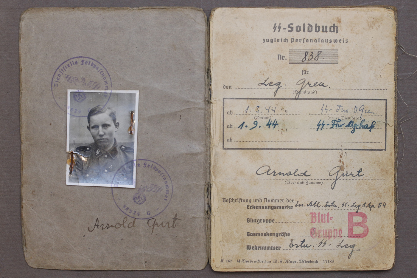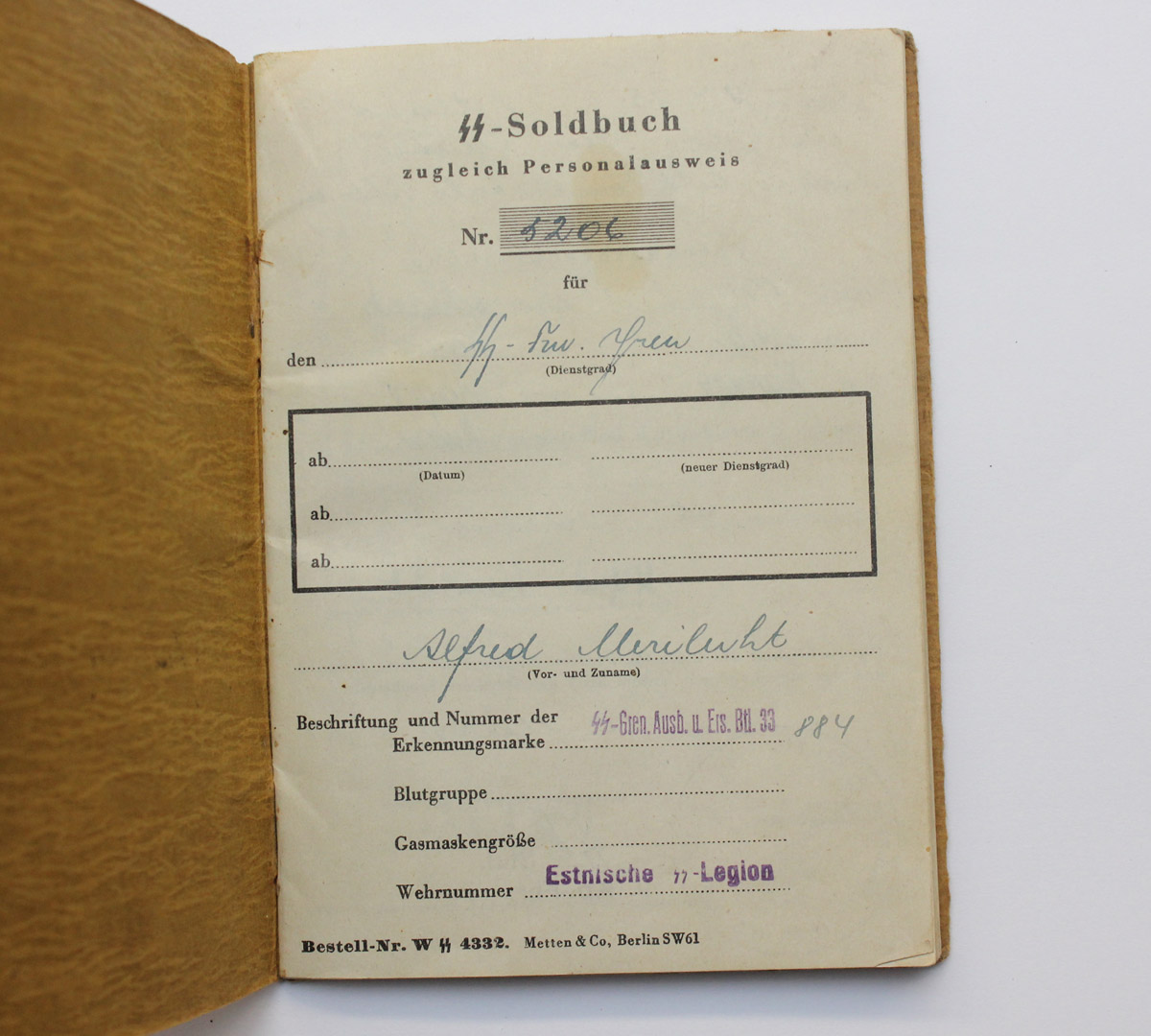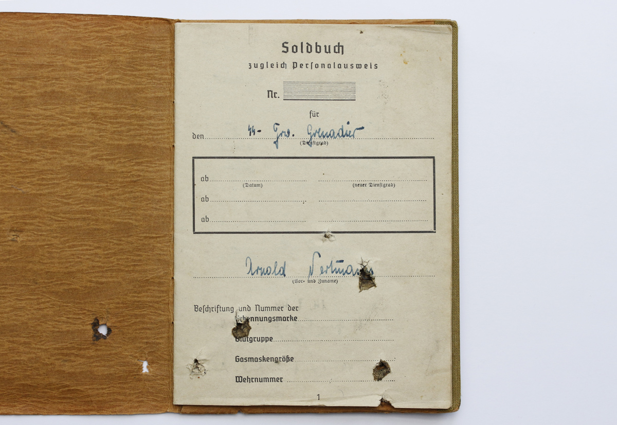 See Wehrmacht'i kaantega Soldbuch on 1944. aasta suvel välja kirjutatud ühele Järvamaalt Säreverest pärit mehele, SS Freiwillige Grenadier Arnold Vertmann'ile, kes teenis 20. Eesti SS diviisi 45. rügemendi II pataljonis. Juuli keskel on ta relvastatud vintpüssi ja püstoliga ning lisaks saanud ka täägi ja kompassi. 1944. aasta septembri teises pooles toimunud üldise taganemise käigus sai Arnold granaadi- või mürsukildudest surmavalt haavata - killuaugud on ka Soldbuch'is. Kamraadid viisid taskust võetud SB Arnoldi vanematele. Tagumise kaane vahele oli ta pistnud ülesvõtte, kus ta on koos oma vanema venna Erich'iga, kes teenis samuti 20. Eesti SS diviisis.