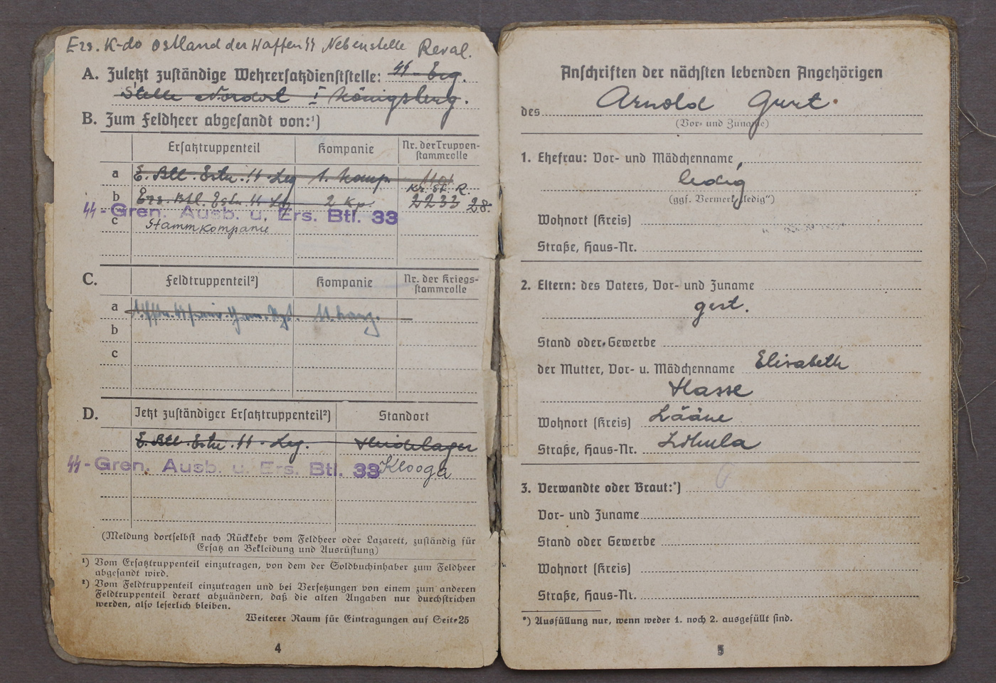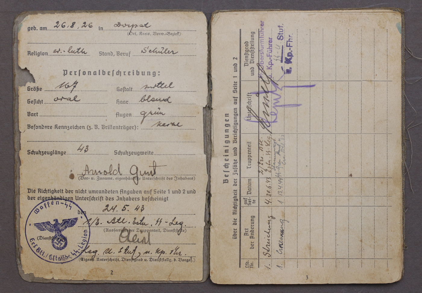 1943. aasta kevadel 16-aastasena vabatahtlikult Eesti Leegionisse astunud Arnold Gurt'i Soldbuch.