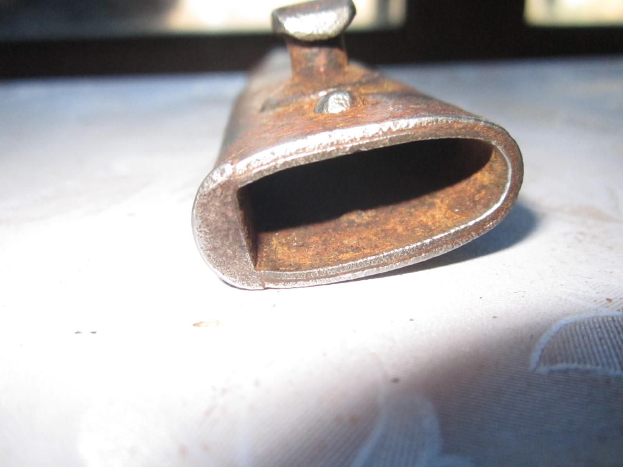 Selline tupe-pikkus 17cm.Noa tera laius mis läheb 2,5cm. Sees fiksaatorid korras.Fiksaatorid needitud . Kahest osast kokku joodetud vasega. Ei ole talumehe töö. Kes teab ?