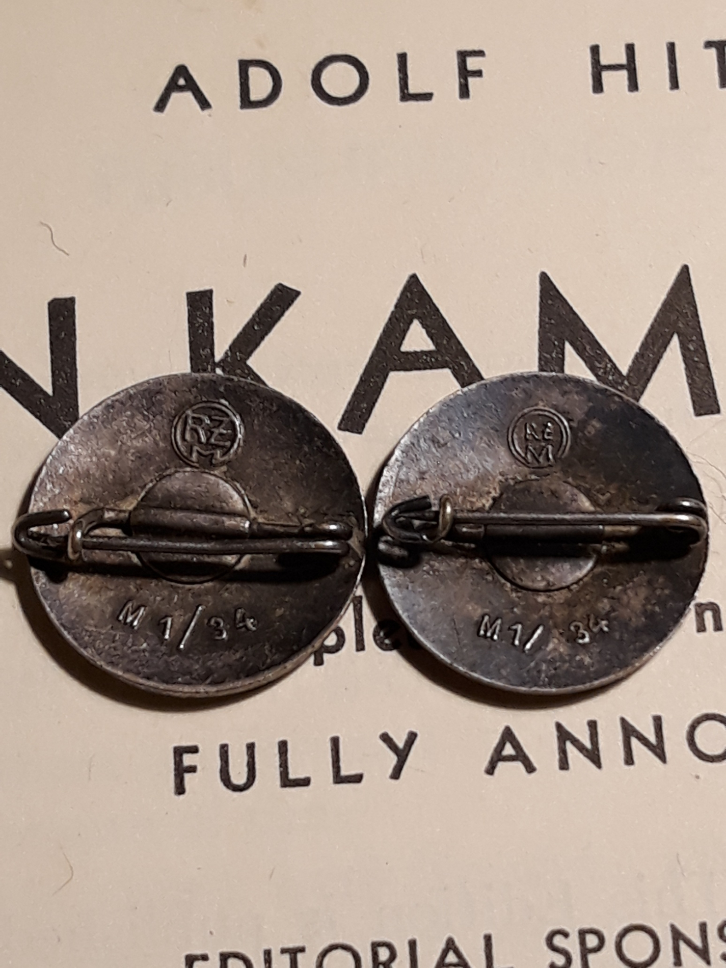Mõnikord võib rõõmsalt üllatuda ka ilma ühtegi uut märki ostmata ja lihtsalt oma kogu korrastades. M1/34 RZM (Karl Wurster, Markneukirchen) on üks tavalisemaid parteimärkide tootjaid ja seega ei midagi erilist. Minu kogus oli see aga üks esimestest märkidest ja kui sain teise sama tootja märgi, siis mõtlesin kunagi selle kas ära vahetada või müüa. Nüüd kogu korrastades aga selgus, et mul on siiski kaks täiesti erinevat M1/34 märki ja seega pole siin vahetada midagi - märgi tagumised küljed on täiesti erinevad: