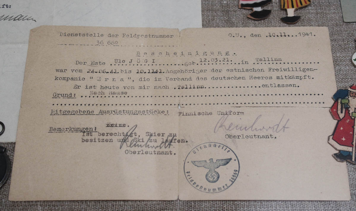 Esimesel dokumendil, mis on välja antud 1941. aasta 16. augustil on kirjas, et eestlane Ülo Jõgi on teenistuses Eesti vabatahtlike kompaniis, mis kuulub Saksa maaväe koosseisu ning tal on lubatud relva kanda. Teine dokument on 2. klassi Raudristi tunnistuse ärakiri (soome vabatahtlik Ülo Jõgi). Kolmandal paberil on kirjas, et eestlane Ülo Jõgi on perioodil 24.06.1941 kuni 10.11.1941 võidelnud Eesti vabatahtlike kompanii "Erna" koosseisus ja lubatakse nüüd koju. Huvitav on veel märge, et kaasa anti ka Soome armee vormiriietus.