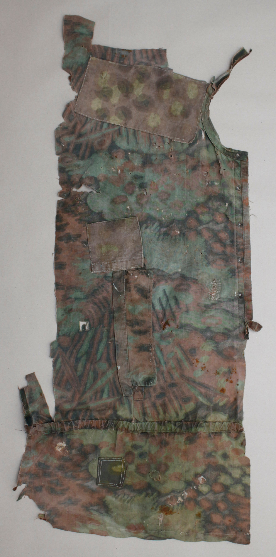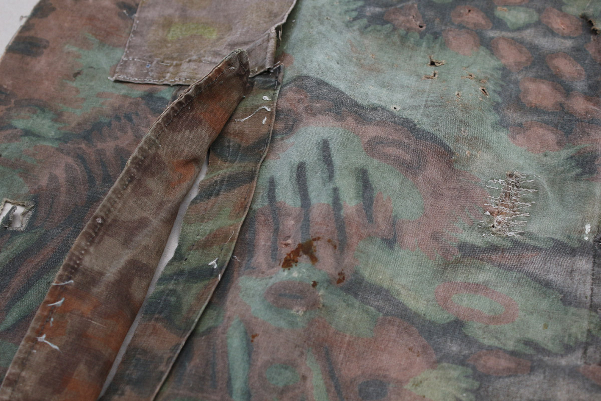 Natuke Palmimustriga maskeerimisjakki, kus on näha lausa viis sõjaaegset parandustööd.