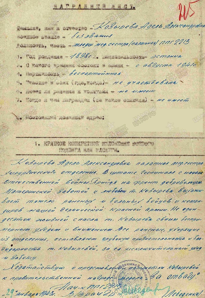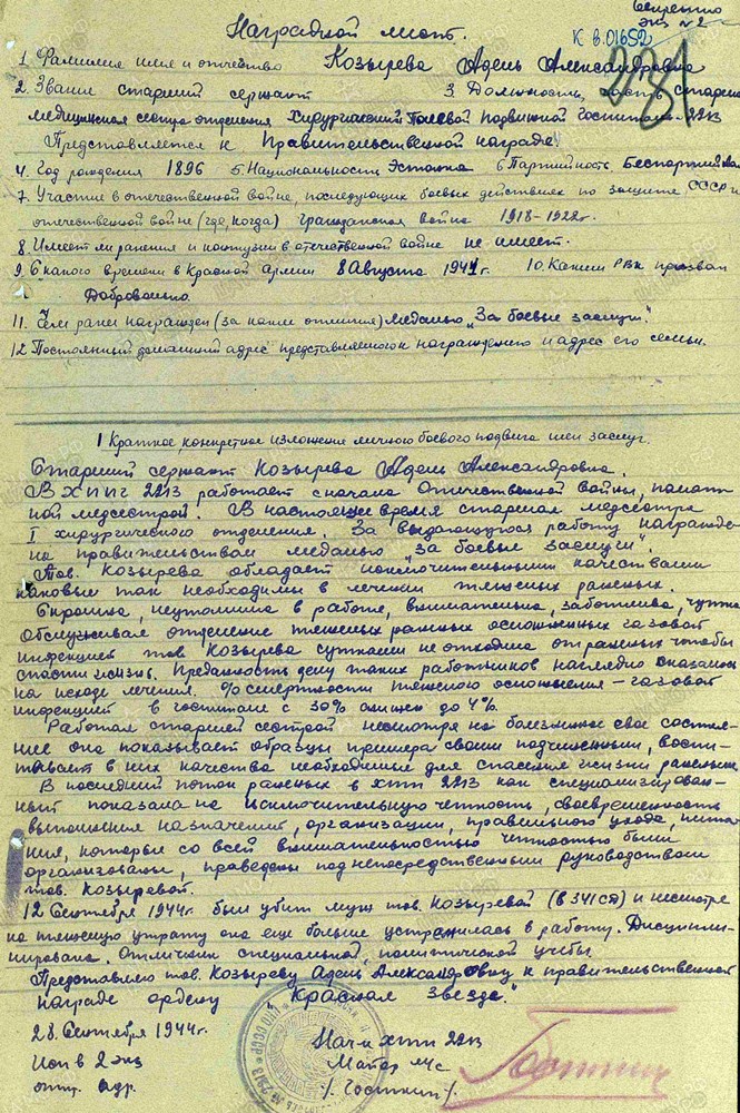 Tänase naistepäeva puhul on paslik lisada foorumisse üks huvitav komplekt. Vanemseersant Adel Aleksandri t. Kozyreva oli 2213. liikuva kirurgilise välihospidali vanemõde. Autasulehtede põhjal vapper ja suure südamega eesti naine. Läks vabatahtlikuna rindele 1941. aasta augustis, Lahinguteenete medali ja Isamaasõja II klassi ordeni kavaler. Ilmselt üks vähestest eestlannadest, keda on autasustatud sõja ajal Isamaasõja II klassi ordeniga.