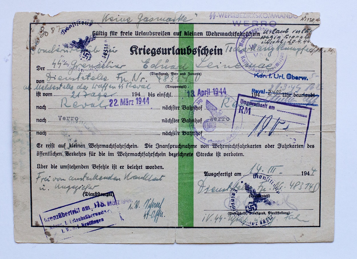 UnterKroon kirjutas:Eelpool kõne all olnud pataljon "Narwa" 3.kompaniisse kuulunud SS Grenadier Eduard Lainemäe Soldbuch ning muud dokumendid ja esemed.