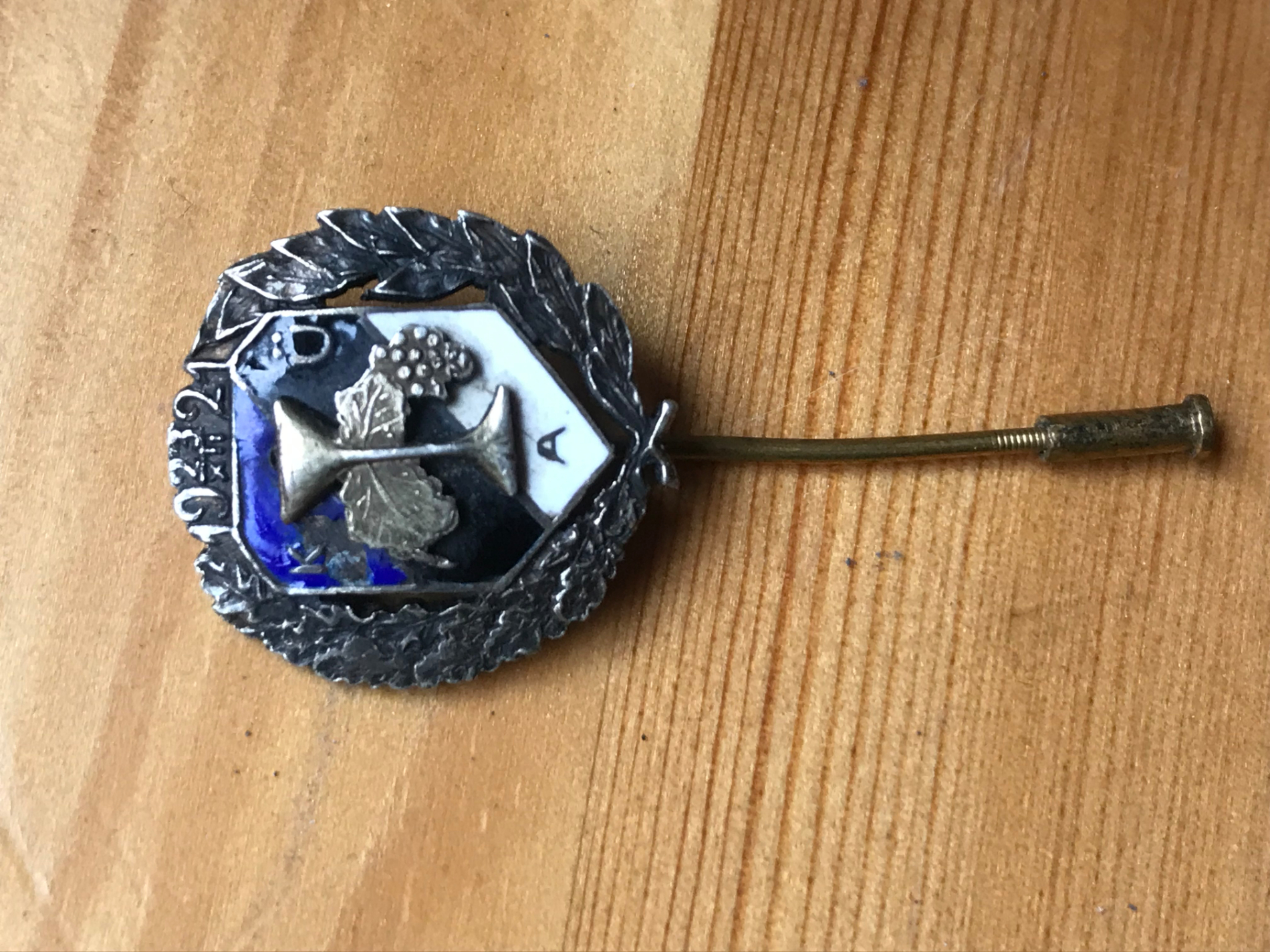 A-tähega asula koduveini ühistu ? Viinamarjakobar,leht ja pokaal viitavad selgesti veinile.