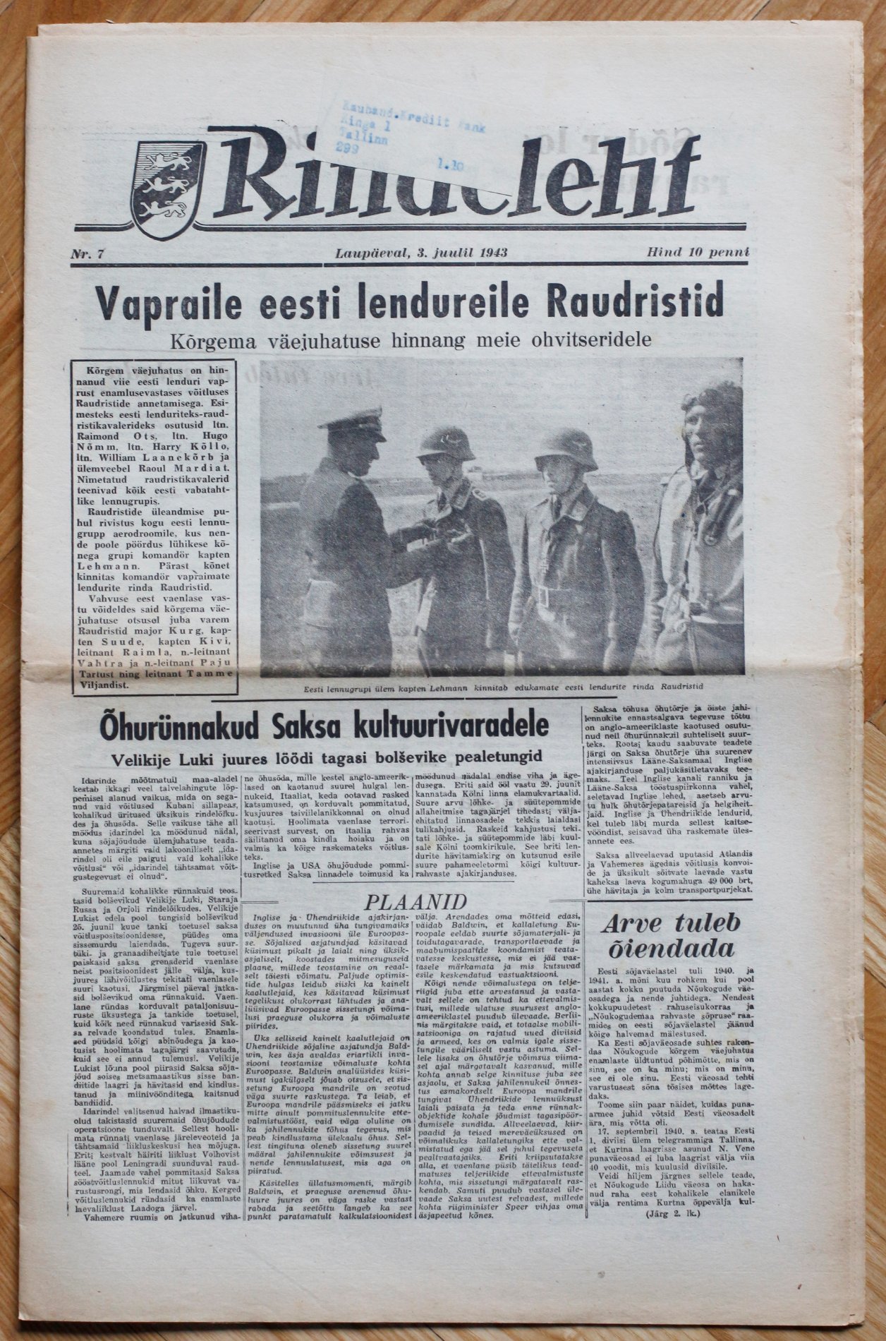 "Rindeleht" nr. 7, 03.07.1943 - Raudrist, Volhov, Kõllo, Volhov, Mikumägi