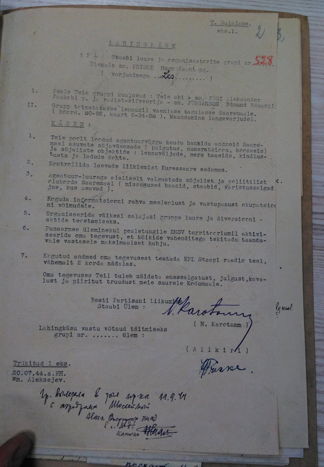 Siin on 1944. aasta juulis Priskele antud lahingukäsk, alla kirjutanud Nikolai Karotamm.