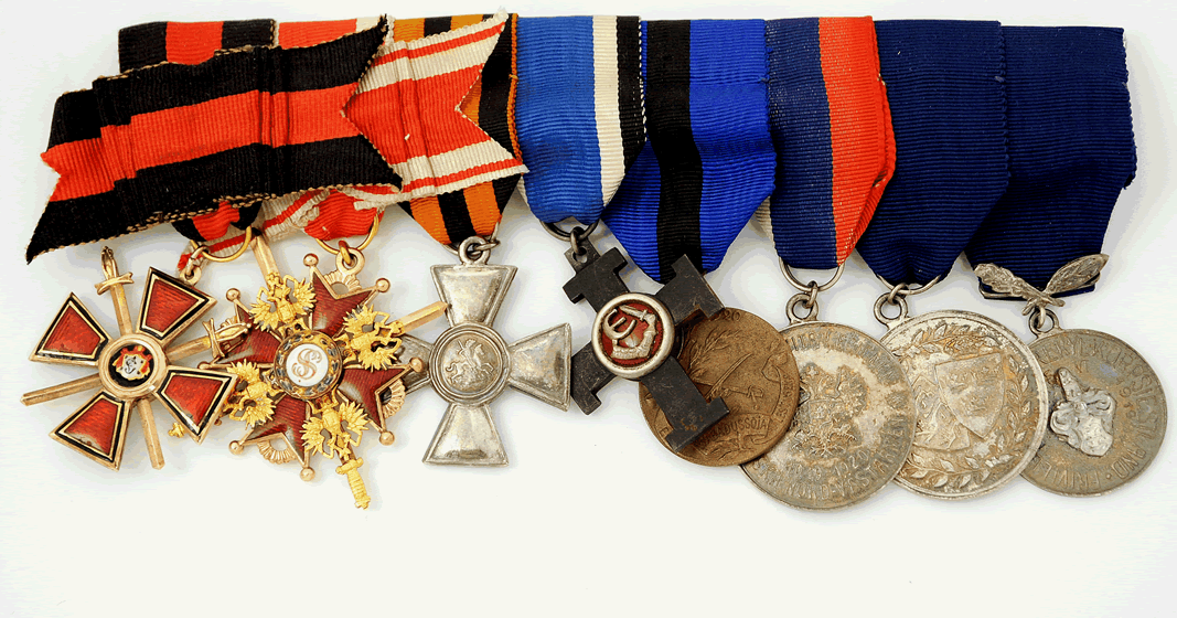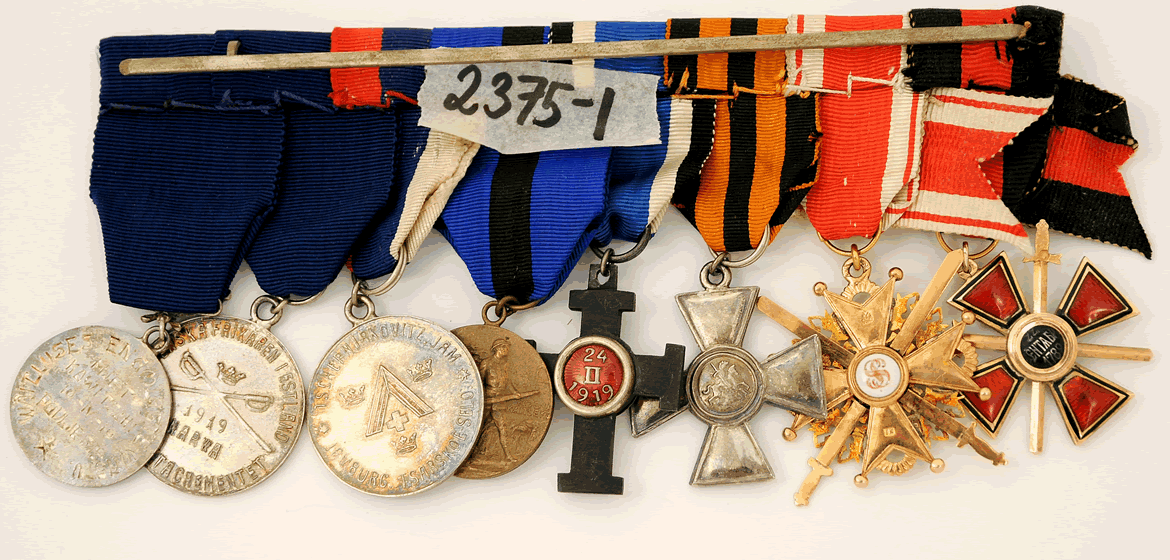 Order of S:t Vladimir, fourth class with swords in gold, 38x33 mm, Order of S:t Stanislaus third class in gold with swords, 40x40 mm IK, Order of S:t George badge in silver, Russia, Cross of Liberty, Estonia, bronze medal Wabadussöja 1918-1920, silver medal “Svenska vita legionen” 1919-1920, silver medal Svenska frikåren i Estland 1919, silver medal Estland 1919. Proveniens: A Scandinavian officer and nobleman who participated in the war against the Bolsheviks after the revolution.