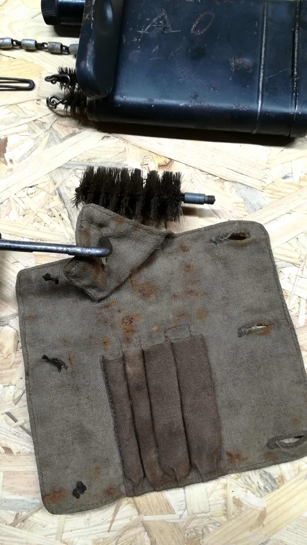 Ostsin hiljaaegu puhastuspinalite sisu assortiikarbi. K98 komplekti panin kokku ja ülemine rida on sama kraam. Need pööratava otsaga vardad peaks ppsh omad olema, see jämedam hari karbi all vast mingi hilisem jahirelv ja too L kujuline varras peaks olema FN Browning oma (aga ilmselt mitte HP, vaid mingite vanemate mudelite jagu). Riidest kott- saan aru, et SVT oma, aga ilmselt justkui vähem levinud, sest tegu on tehasest tulnud kolme nööbiga isendiga, hiljem enam nii palju nööpe ei jagunud. "Toru" pinal on mosina oma, need vasakul keskel olevad virblid ja võti peaks SVT jagu olema, aga kõvera otsaga varras ja harjahunnik vajaks veel suunamist. Kõige parempoolsemal kahel harjal on peale pressitud "K" ja üldiselt ei tundu need vene nägu olevat.