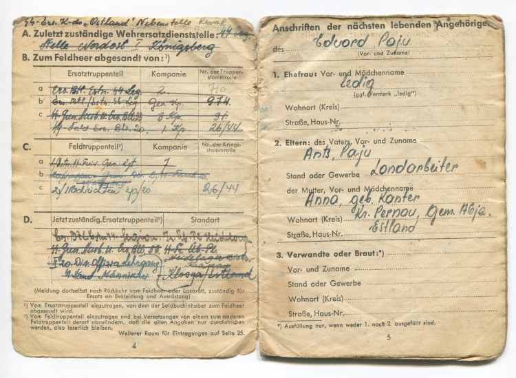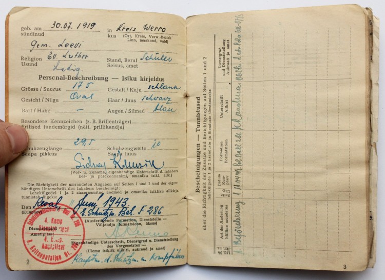 1943. aasta aprillis Eesti Leegionisse astunud Grenadier Eduard Paju Soldbuch.