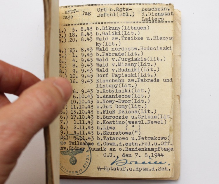 Mitmest partisanide vastasest operatsioonist ja paljude lähivõitluspäevade sissekannetega 286. Politseipataljoni Oberwachtmeister Sidney Kuusik'u palgaraamat. Leo Tammiksaare kollektsioon.
