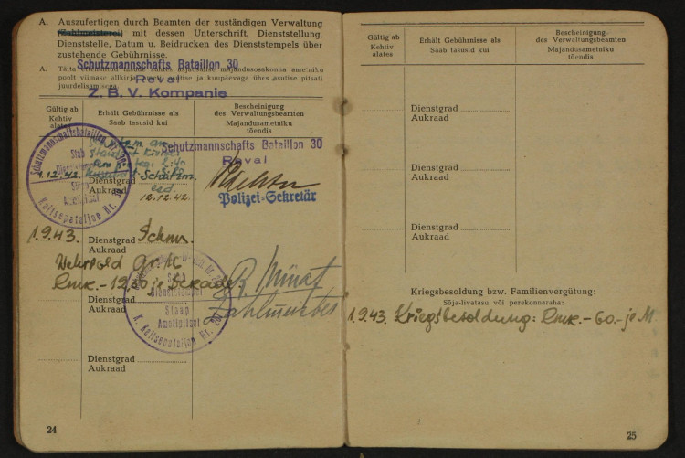 Palgaraamatus on ka mitu Waffen-Sturmbannführer August Vask'i VR II/2, II/3 allkirja, kes oli 20. SS väljaõpperügemendi ülem.