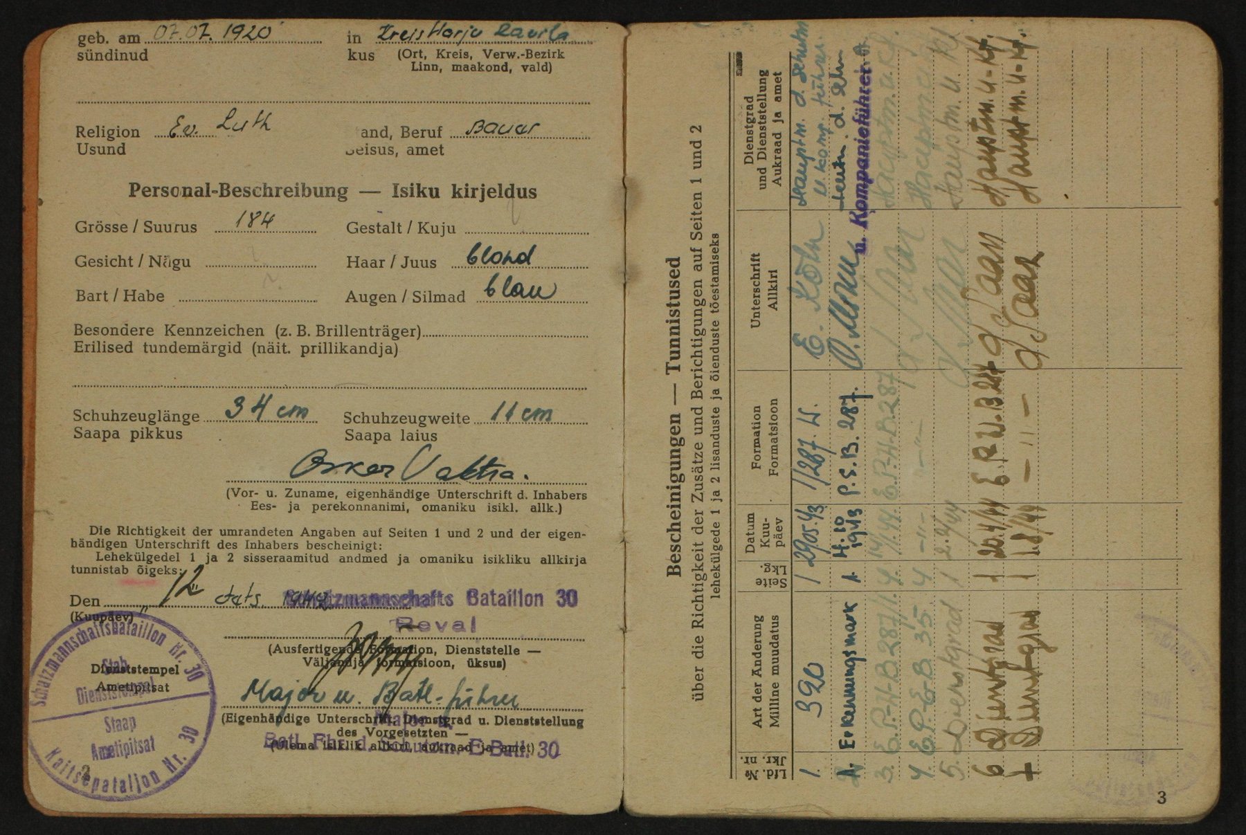 Palgaraamat on välja kirjutatud 1944. aasta 30. oktoobril aga sõjaväes teenis mees juba enne seda kuupäeva, sest veel enne Eestist taganemist, 15. septembril on talle välja kirjutatud vintpüss (Mod.27).