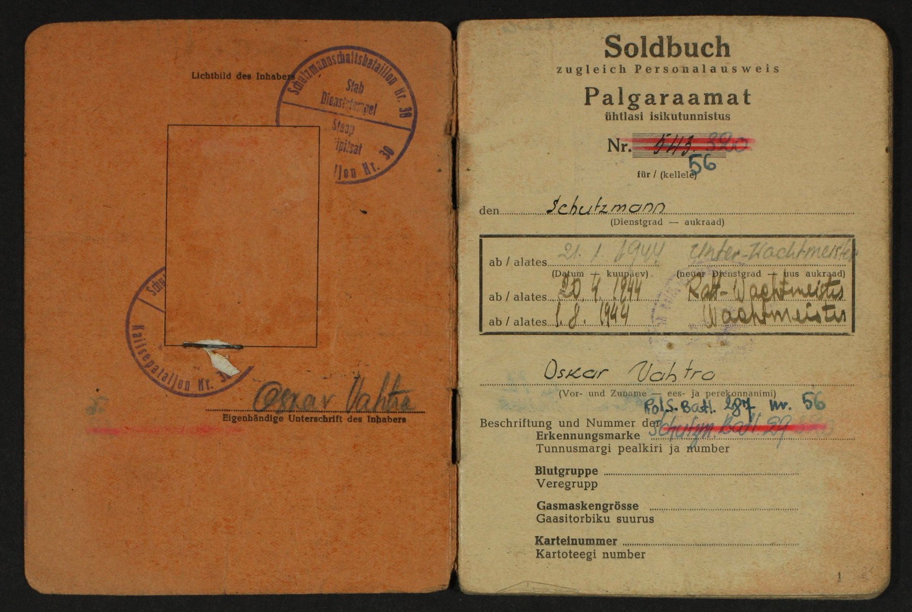 Palgaraamatus on ka mitu Waffen-Sturmbannführer August Vask'i VR II/2, II/3 allkirja, kes oli 20. SS väljaõpperügemendi ülem.