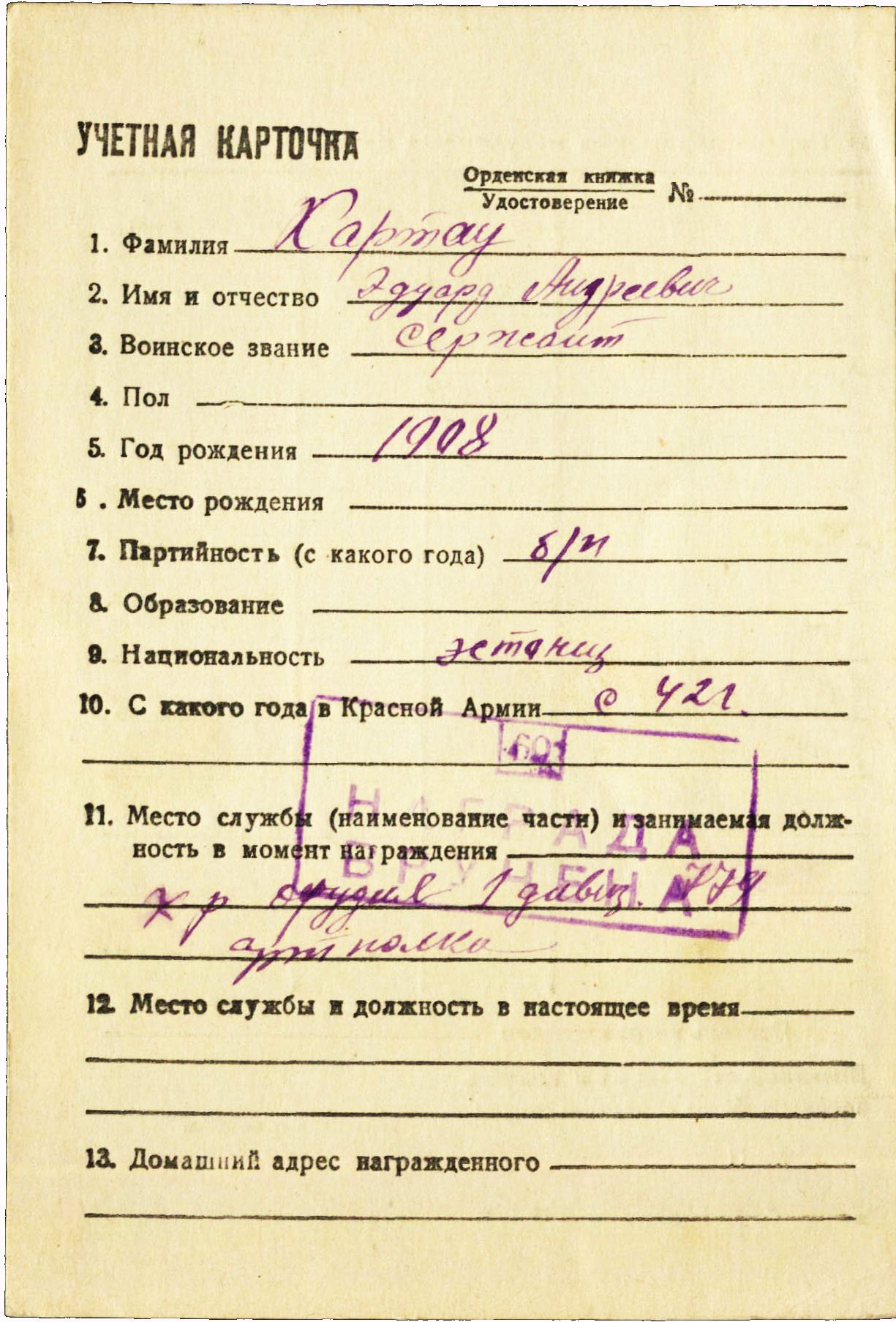 Seersant Eduard Kartau, 249. Laskurdiviisi 779. suurtükiväepolgu 1. divisjoni 1.patarei relvakomandör. Isamaasõja II klassi orden nr. 125564 kavaler.