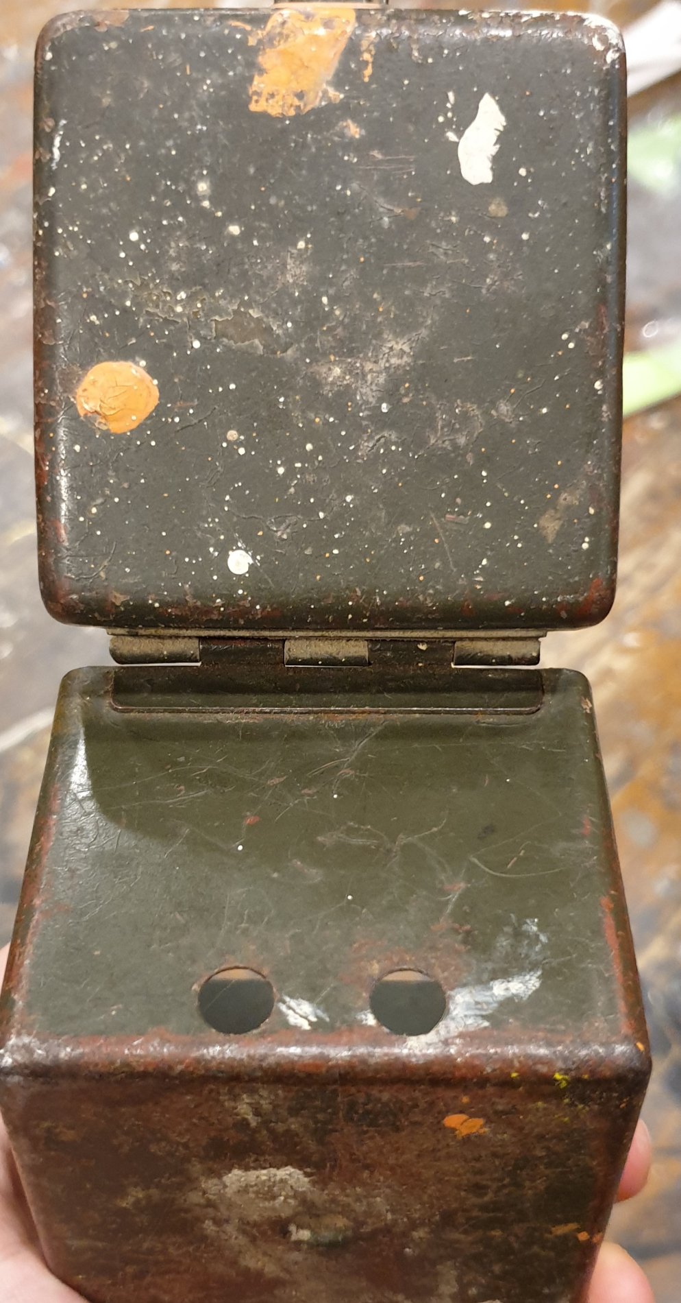 Kas on keegi kohanud sellist värgindust? Rooste alt paistab siit-sealt rohekas värvus. Kas võib tegu olla militaarse esemega? Esimese hooga kangastus ϟϟ-kuseproovi võtmise anum.