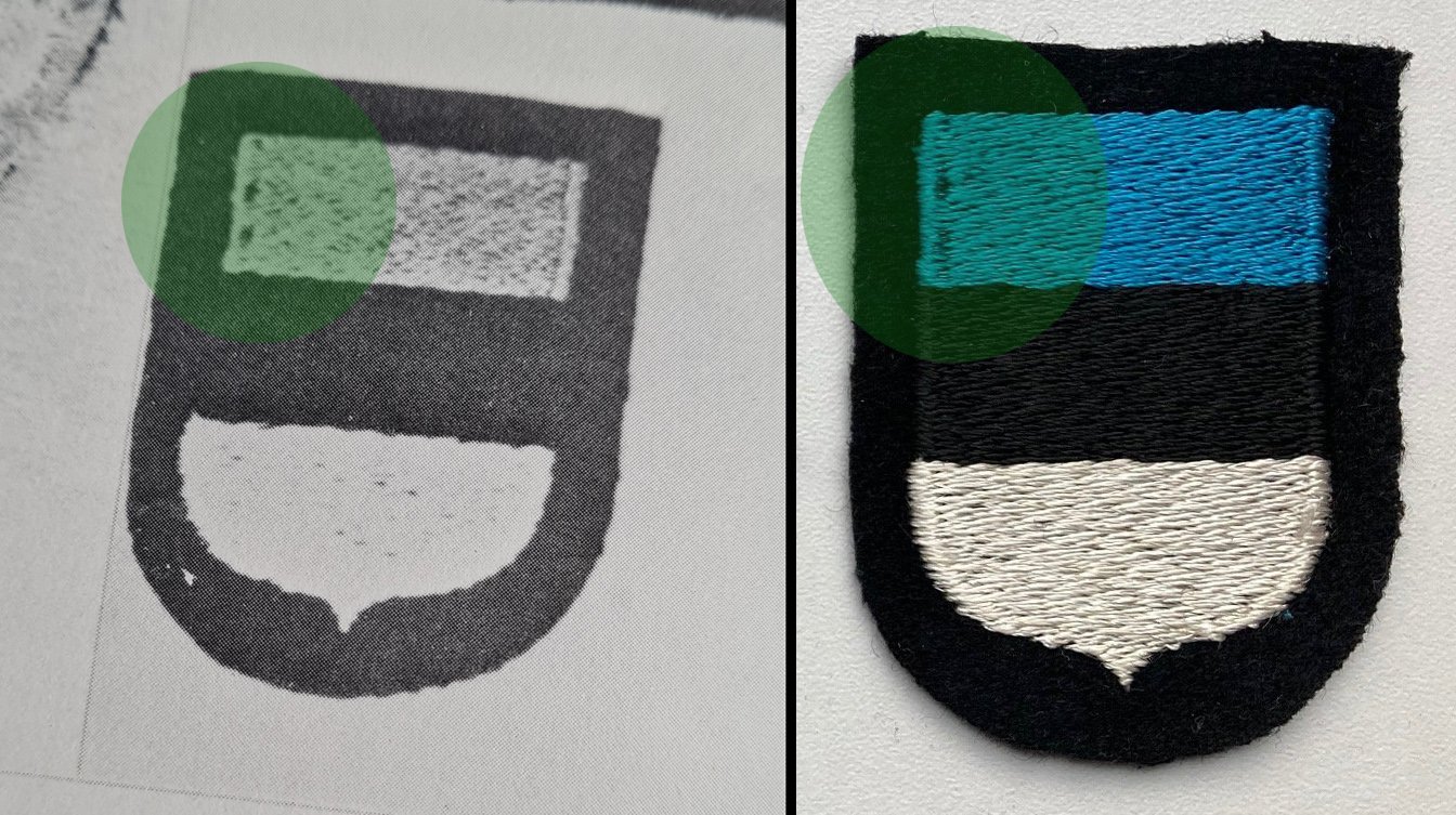 Mõned tunnid tagasi Facebookis läbi jooksnud fotol on väga sarnase tegumoega varrukakilpi. Fotol jooksevad trikoloori triibud teistpidi, kuid foto võib olla peegelpildis, sest on negatiivilt võetud.