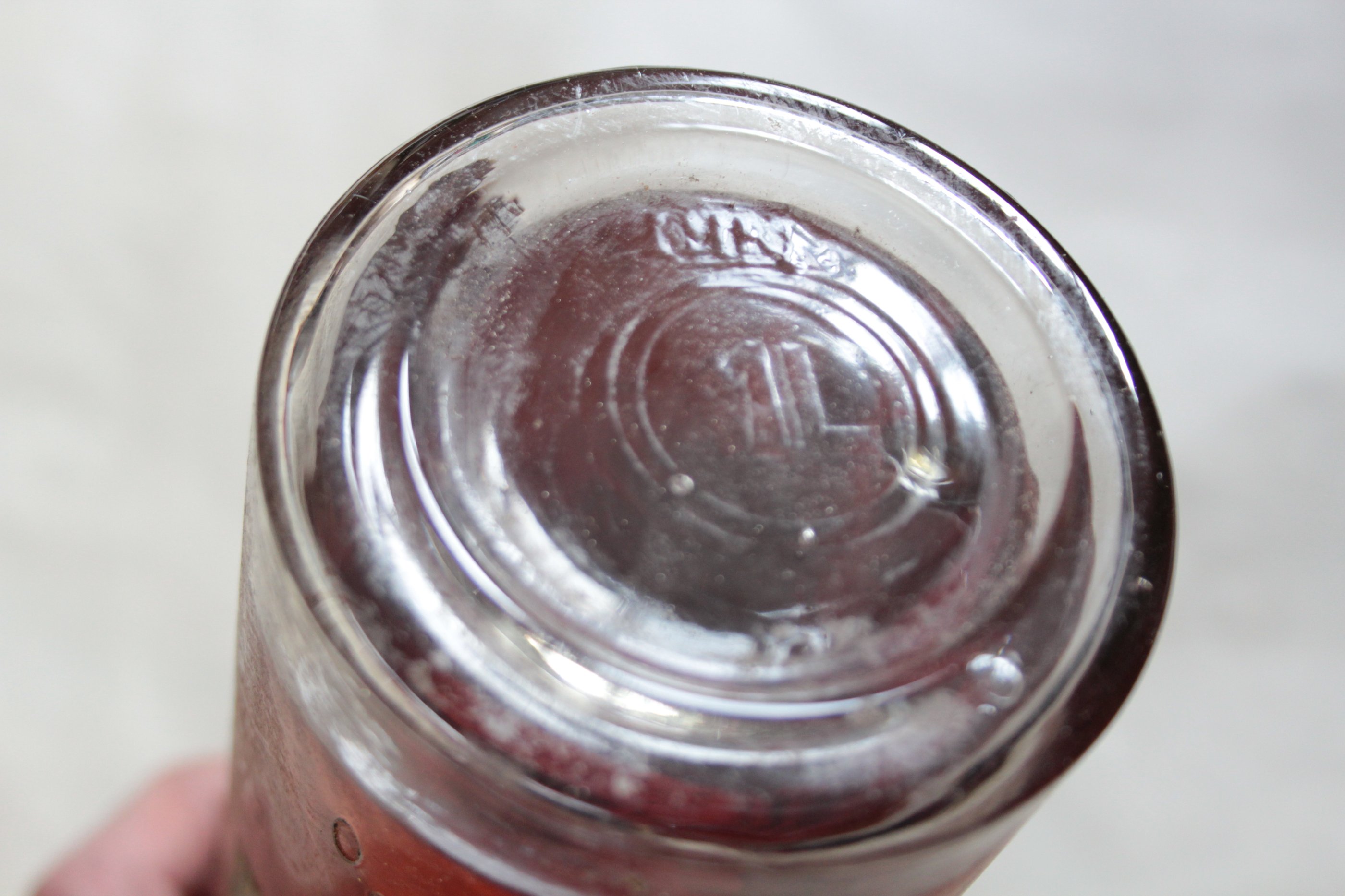Haruldane leid. Oli peidetud pööningule liiva sisse. Seisnud küliti ka peale leidmist ja midagi pole ära aurustunud. Korgi peal käis paber panderoll. Pudeli põhjal DIN markeering ja 1L. Sees on algne brändi mitte perenaise sõstravein. Sete on vanadele brändidele loomulik. Võimalik, et kratitud kusagilt saksa ladudest kuna pööningul vedeles ka lõigutud saksa riietust ja varustust.