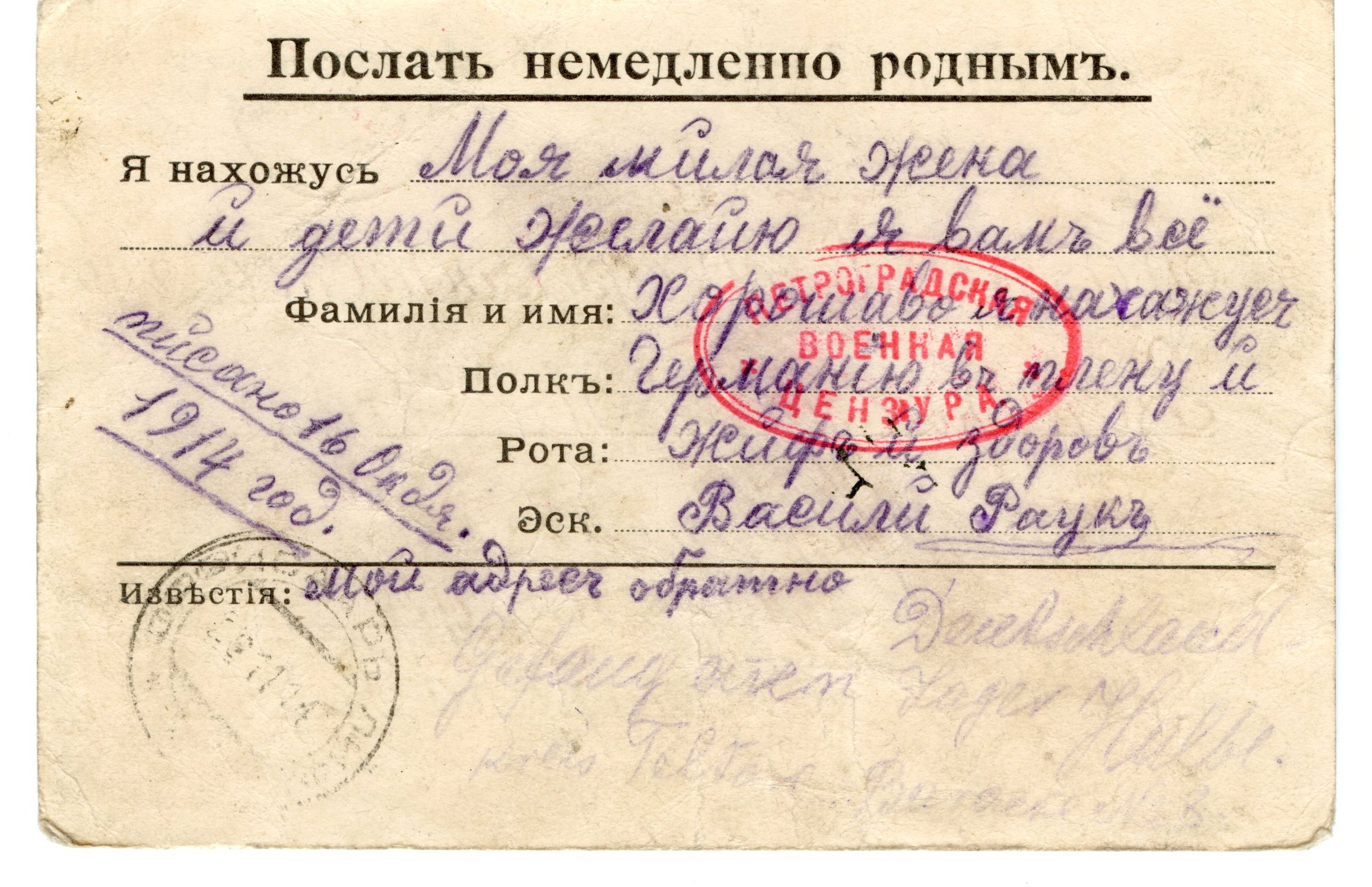 Hindrik kirjutas: Teatan et olen terve ja asun Saksamaal. Kirjuta mulle kuidas teie seal elate, kirjuta postkaardile ja vene keeles. Tervised kõigile minu seltsimeestele. 18.10.1915. Pole teada kas Hindrik ise ka pildil on