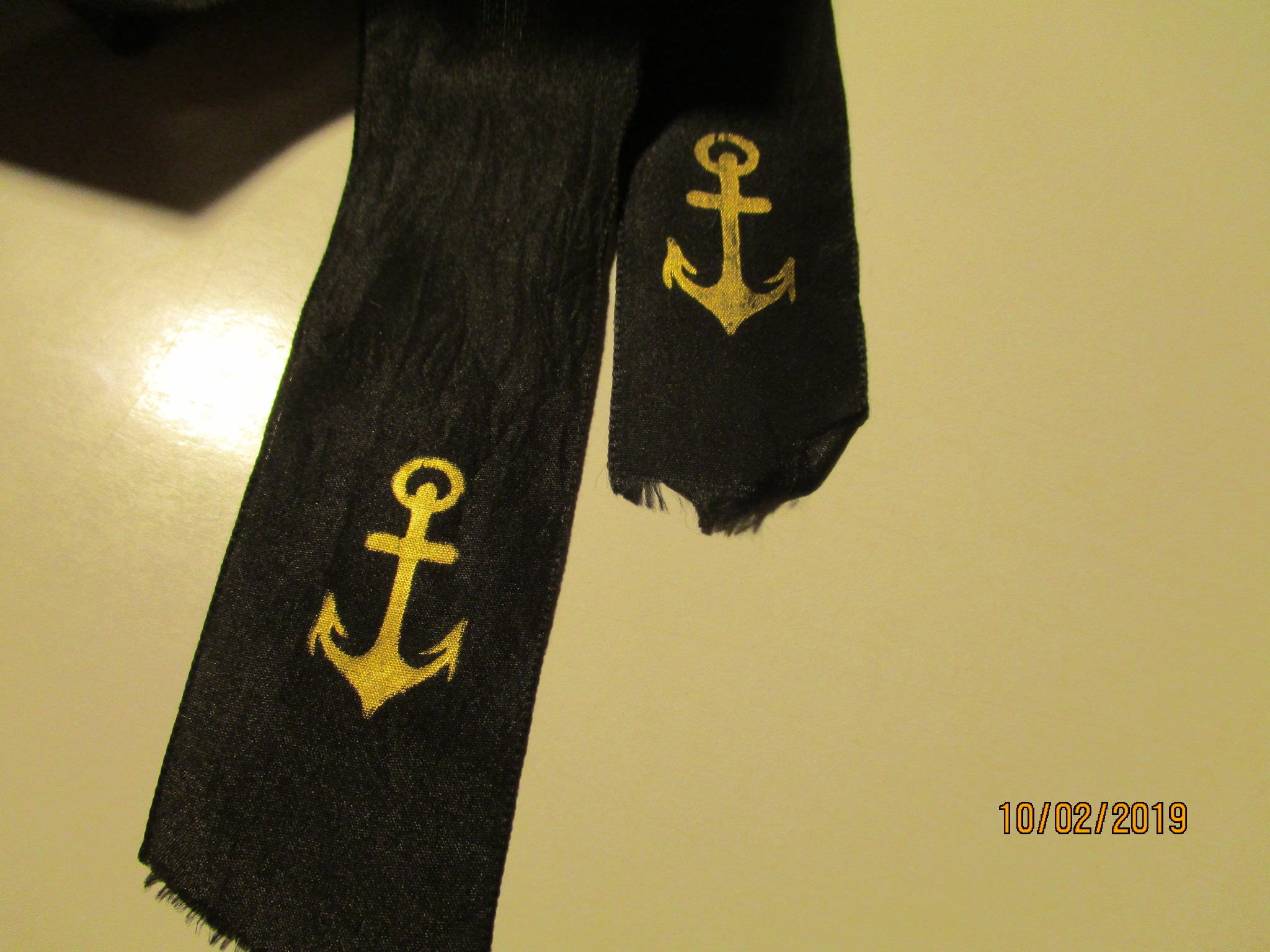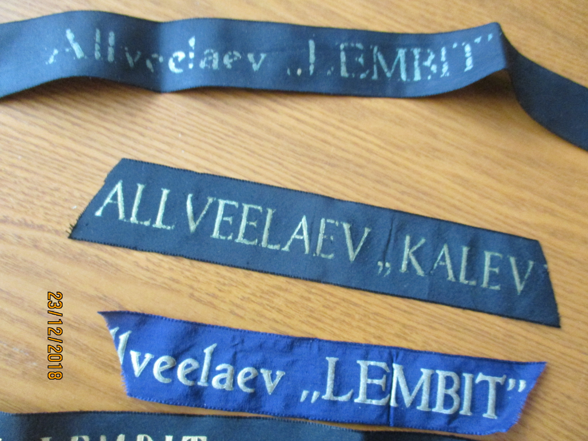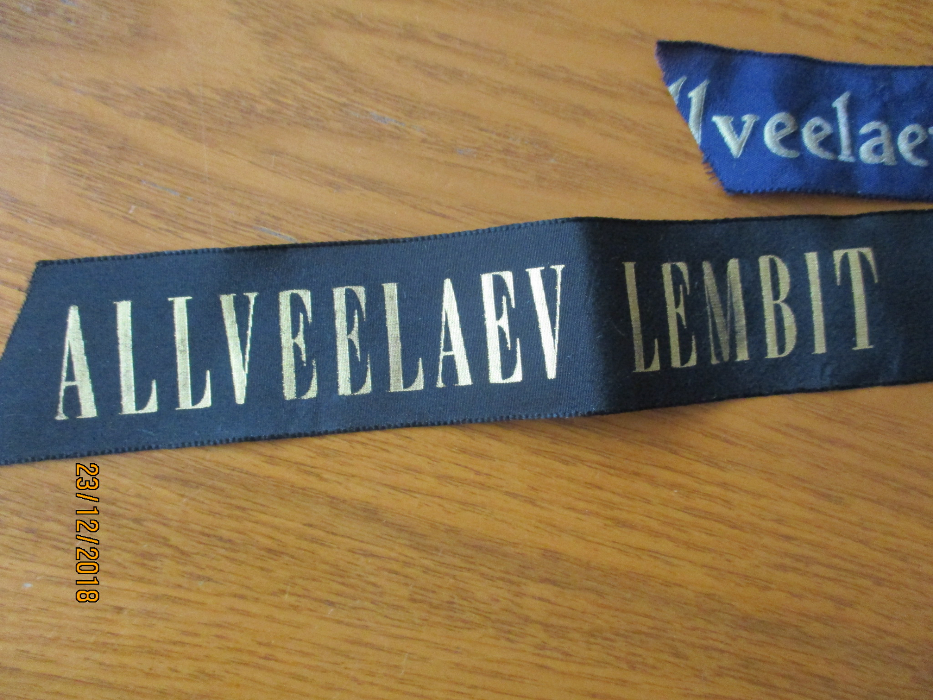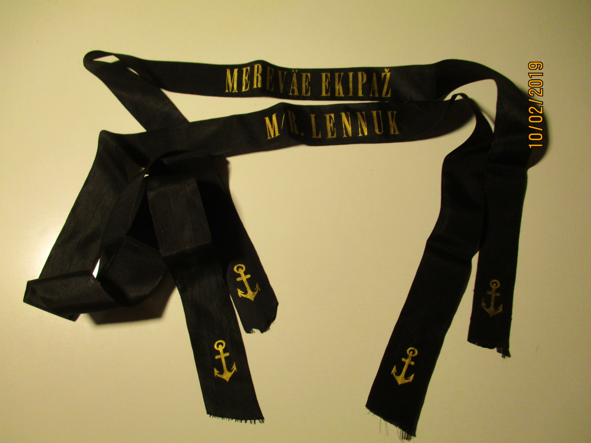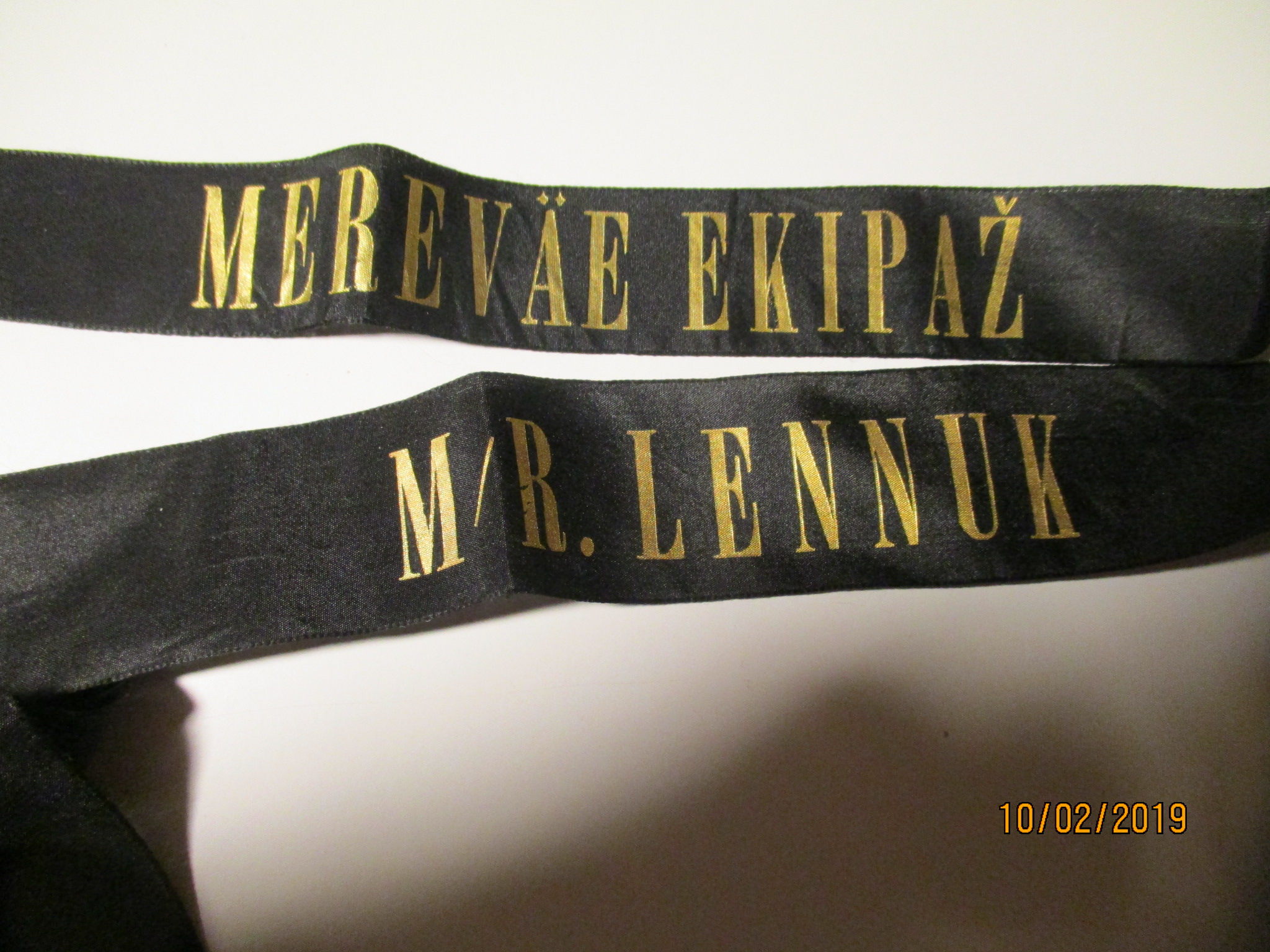 Huvitav lint, mille ühele poolele on trükitud "INE MEREWÄE JAUSKOND" ja teisele poolele "MEREWÄE STAAB".