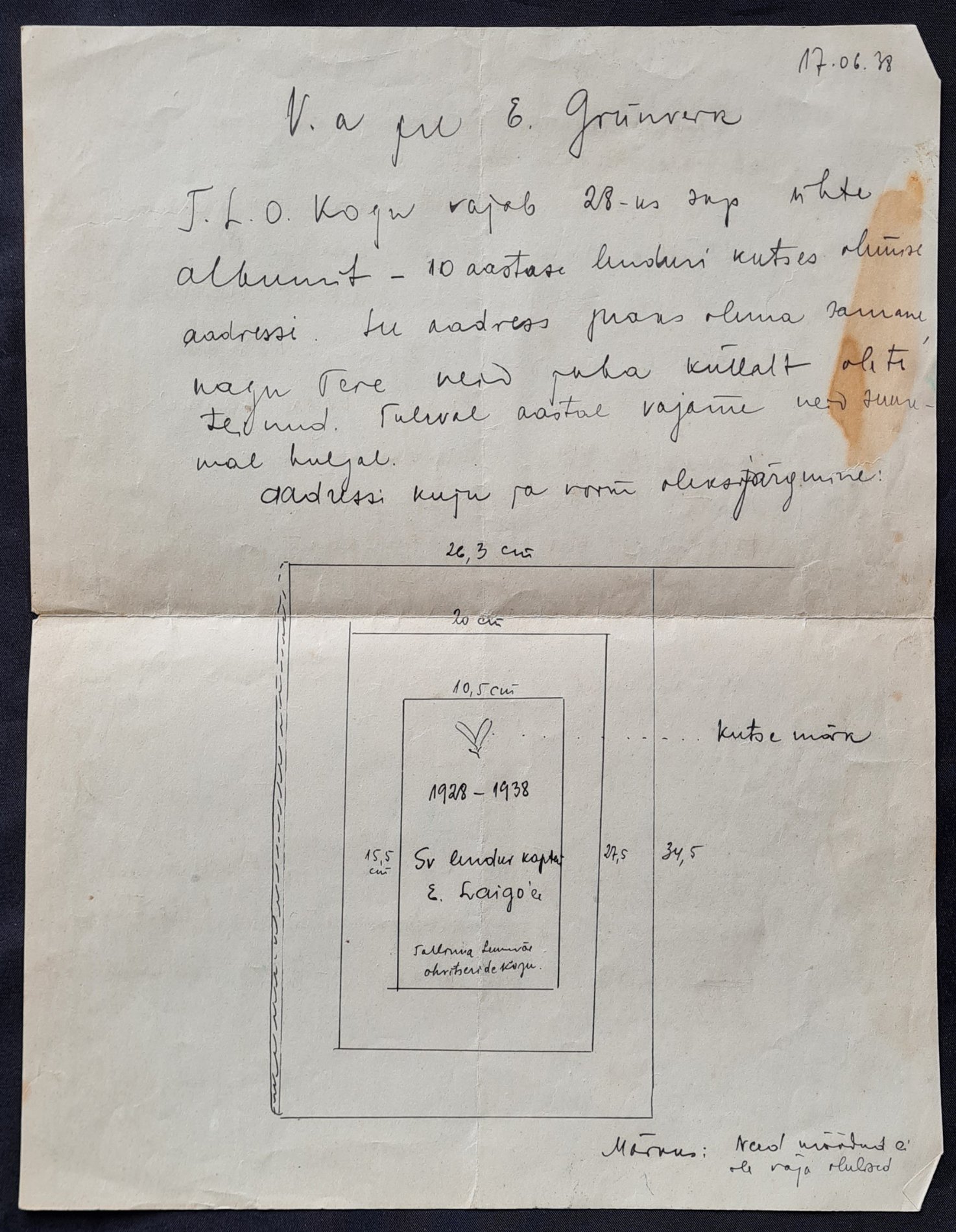 Natuke teavet ka selle nahkehistöö kohta. Võimalik, et see info on juba varasemalt mõnes EW aegset nahkehistööd puudutavas raamatus ilmunud aga võib-olla ka mitte. Mõned nädalad tagasi õnnestus Tartust ühelt garaažiriiulilt leida suur hulk nahakunstnik Elsa Grünverk'i pärandit - erinevaid kavandeid ja natuke kirjavahetust. Väike osa sellest pärandist puudutab just neid samu lendurvaatlejatele kingitud auaadresse. Ma arvan, et see Kopvillem'i oma on samuti Grünverk'i töö, sest 1938. aastal Tallinna Lennuväe Ohvitseride kogu poolt saadetud kirjas on öeldud, et ta on neid juba hulgim valmistanud.