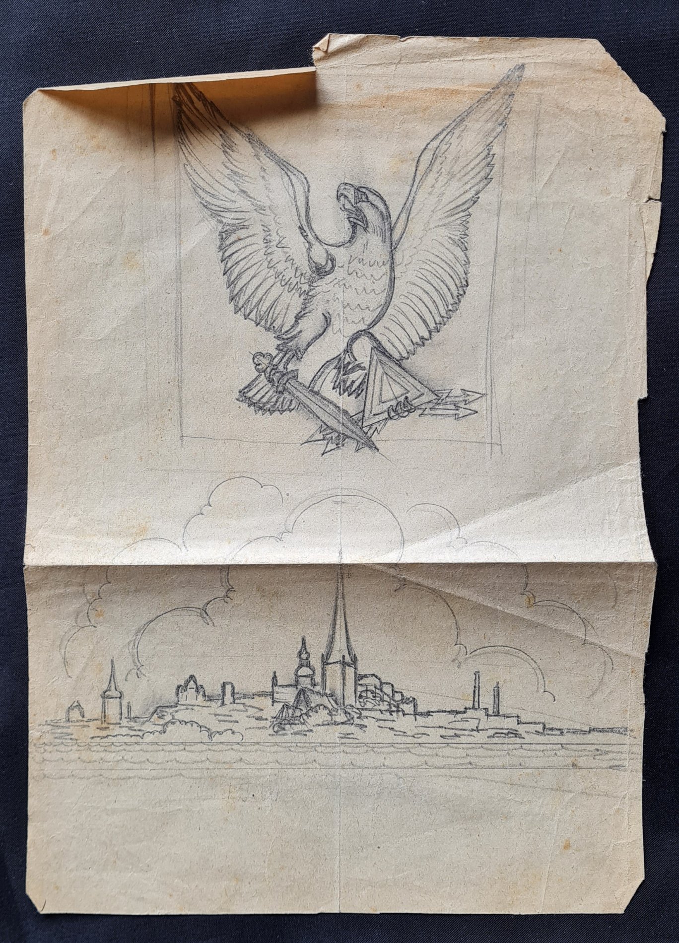 Natuke teavet ka selle nahkehistöö kohta. Võimalik, et see info on juba varasemalt mõnes EW aegset nahkehistööd puudutavas raamatus ilmunud aga võib-olla ka mitte. Mõned nädalad tagasi õnnestus Tartust ühelt garaažiriiulilt leida suur hulk nahakunstnik Elsa Grünverk'i pärandit - erinevaid kavandeid ja natuke kirjavahetust. Väike osa sellest pärandist puudutab just neid samu lendurvaatlejatele kingitud auaadresse. Ma arvan, et see Kopvillem'i oma on samuti Grünverk'i töö, sest 1938. aastal Tallinna Lennuväe Ohvitseride kogu poolt saadetud kirjas on öeldud, et ta on neid juba hulgim valmistanud.