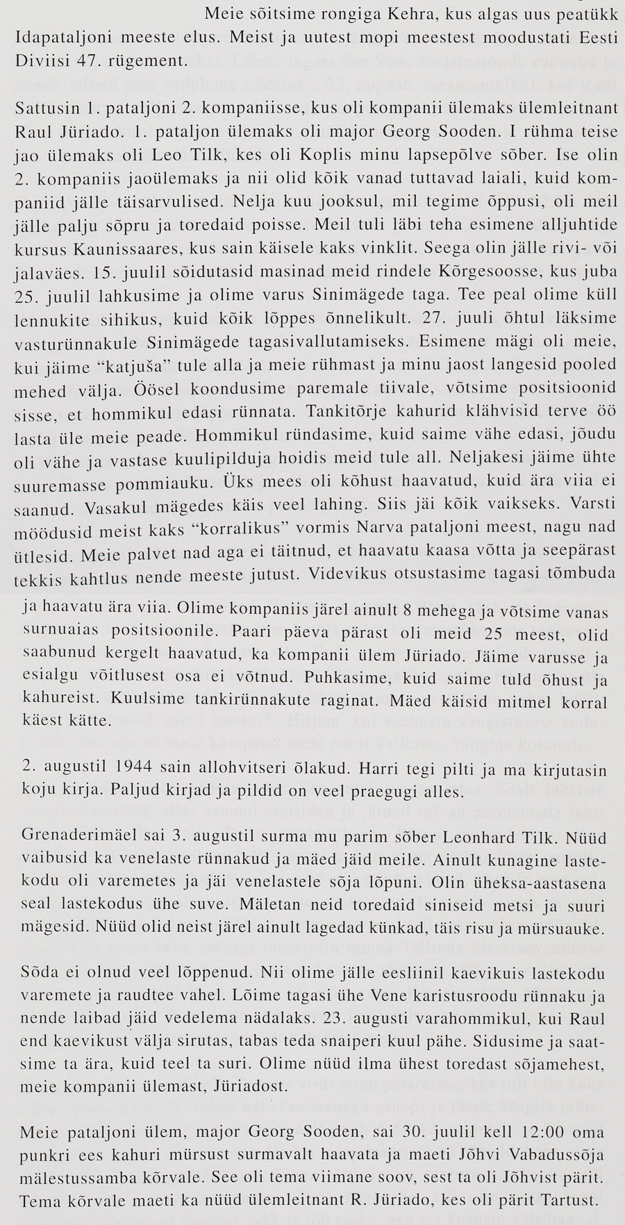 1989 on mälestused kirja pannud Oskar Kaat (vt ka https://www.rindeleht.ee/foorum/phpBB2/ ... 21#p103821): 27. juuli pealelõunal sõideti rindele. Autokolonn jäi suurtükiväetule alla, seejärel liiguti hajutatult eesliini poole. Edasiliikumine takerdus esimese mäe juures suurtükiväe ja katjuušade tule all. Nähti sakslasi mäest alla jooksmas suurel arvul. Rünnati seejärel Vaivara Lastekodu kandist Grenaderimäge, kust vastane välja löödi. Kohati tekkis käsitsivõitlus. Õhtul kl poole 10 paiku sai Sooden miinist kõhust surmavalt haavata.