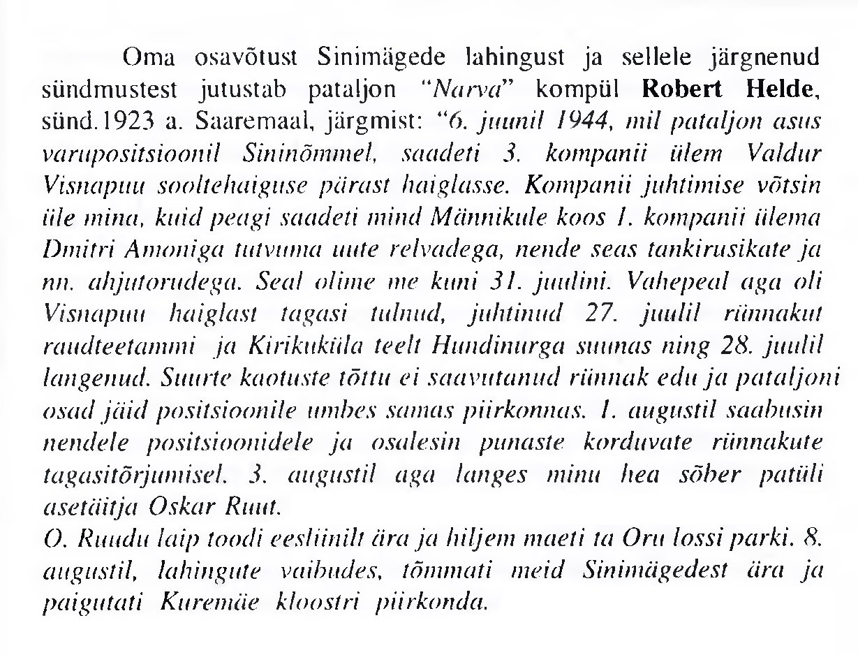 1952 avaldati paguluses anonüümsed mälestused: Sinimägedesse positsioonile liiguti õhtul enne pimedat, liikumine lõpetati öösel.