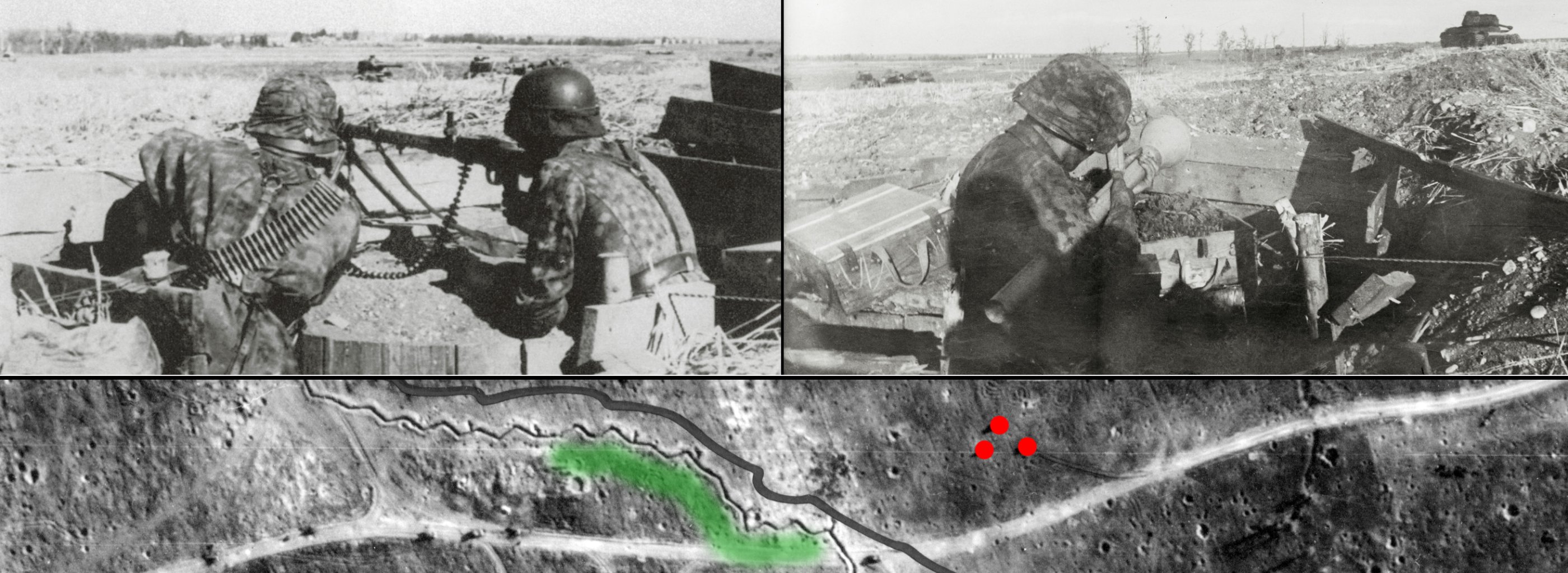 Panin ühele pildile ja lisasin aerofoto kohast, kus on need kolm tanki. Natuke ajab segadusse, et kuulipildurite positsioonile tunduvad need tankid natuke lähemal olema kui Panzerfaust'i mehele aga pildistamisnurk on selline, et positsioon peaks neil olema PF-mehest natuke kaugemal tagapool. Tankikolmik on umbes 50 meetrit maanteest, kaevikutest jäävad need umbes 100 meetri kaugusele aga pildistamisnurk on selline, et sellest kohast, kus ülesvõtted on tehtud peaks olema tankideni 150-200 meetrit.