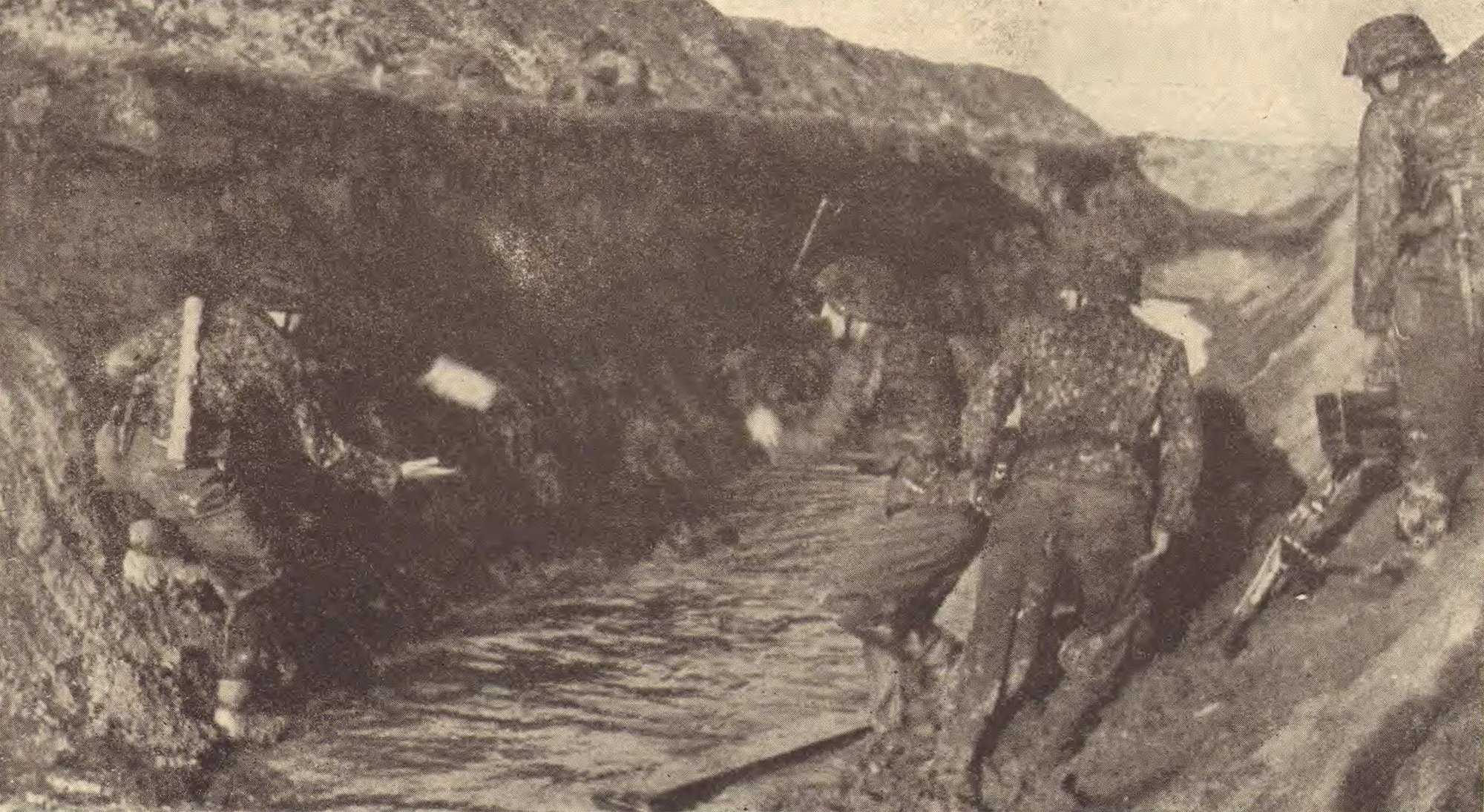 1944. aasta 3. augustil ajakirjas "Münchner Illustrierte Presse" ilmunud ülesvõte eestlastest. Pildi allkiri on "Estnische SS-Freiwillige im Einsatz. Ein Panzergraben ist voll Wasser gelaufen. Über ihn hinweg führt der Gegenstoss. Die Munitionkästen werden hinübergeworfen, bevor die Männer durch das knietiefe Wasser waten, was durch die glitschige Grabensohle nicht so einfach ist.". Eesti keeles oleks see lühidalt nii: "Tankikraav on vett täis jooksnud ja vasturünnak läheb üle selle. Laskemoonakastid visatakse üle enne kui mehed põlvesügavusest veest läbi lähevad, mis aga ei ole väga kerge, sest kraavi põhi on libe.". Siin ei ole otseselt mainitud, et tegemist on Tannenbergi liiniga aga sõnad tankikraav ja vasturünnak panevad mind mõtlema, et ega Narva rinde mingis muus lõigus see aeg sellist asja toimuda ei saanud. Ise pakuksin pildistamiskohaks Haavast loodes olevat maantee ja raudtee vahelist ala.
