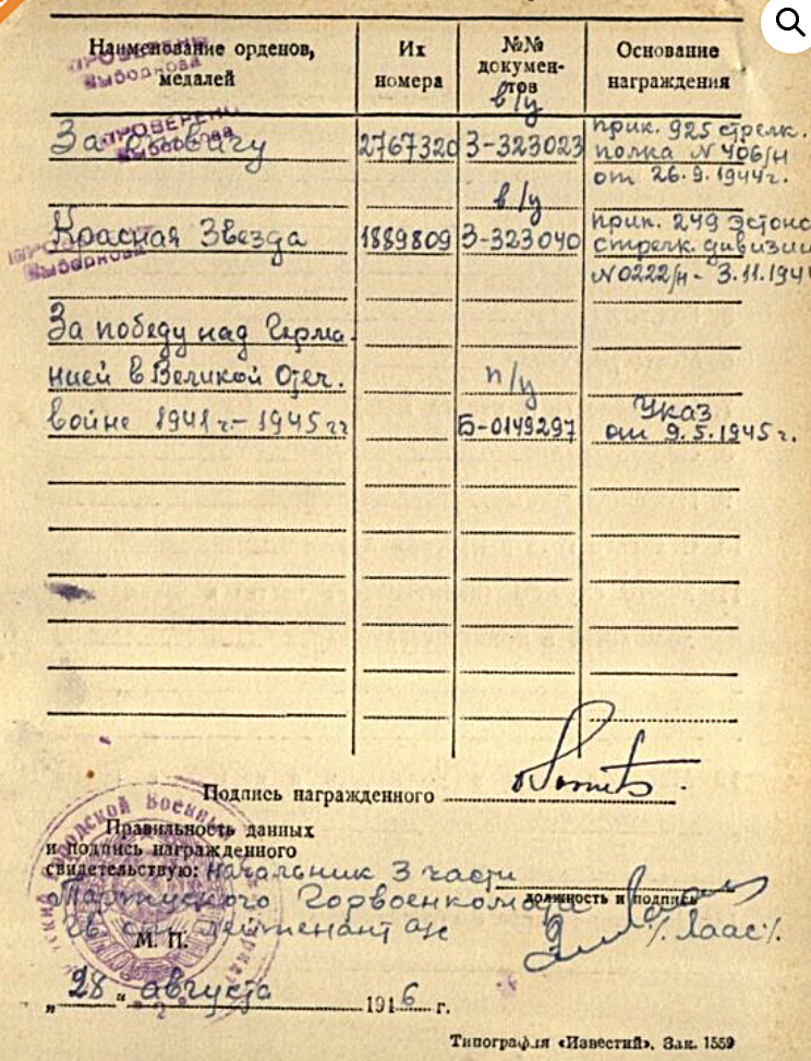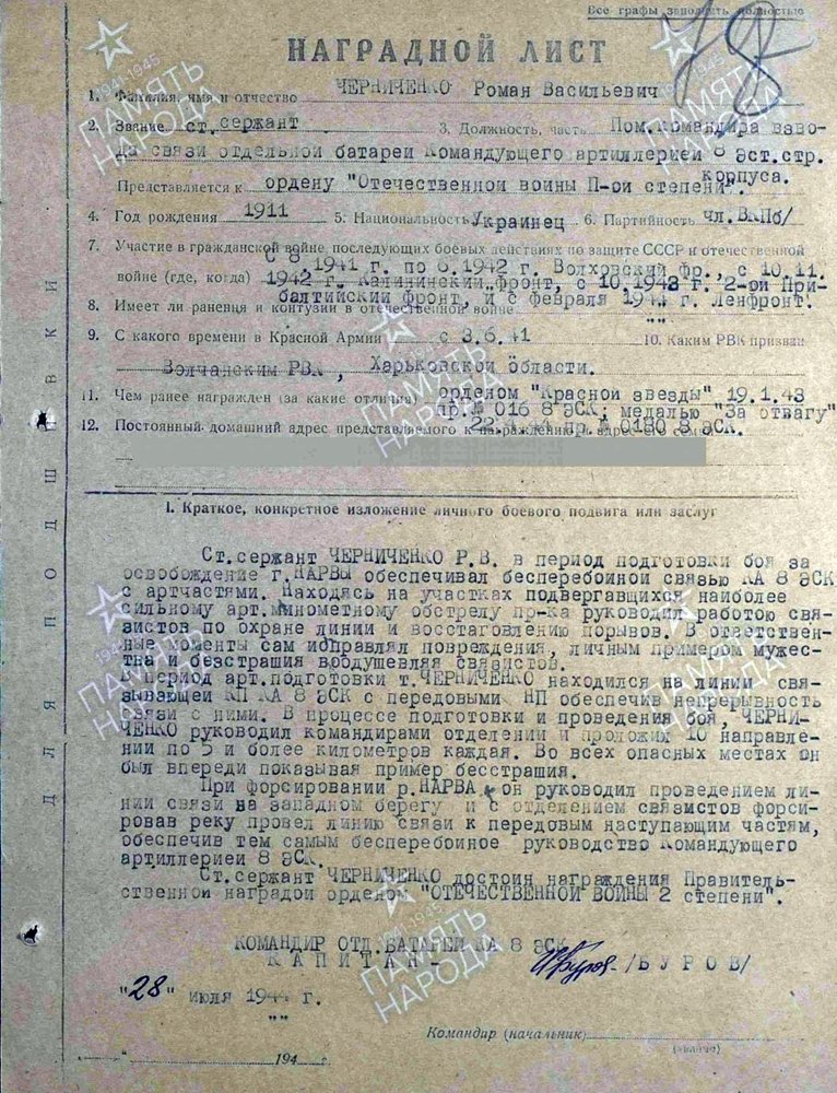 ELK üksiku suurtükiväe patarei siderühma komandöri abi vanemseersant Roman Chernichenko Isamaasõja II klassi orden nr. 125520. Saadud Narva lahingute ja Narva jõe forsseerimise eest. Toimetas seal side ja sideliinidega. See orden oli vist kuskil Ukraina foorumis müügis.