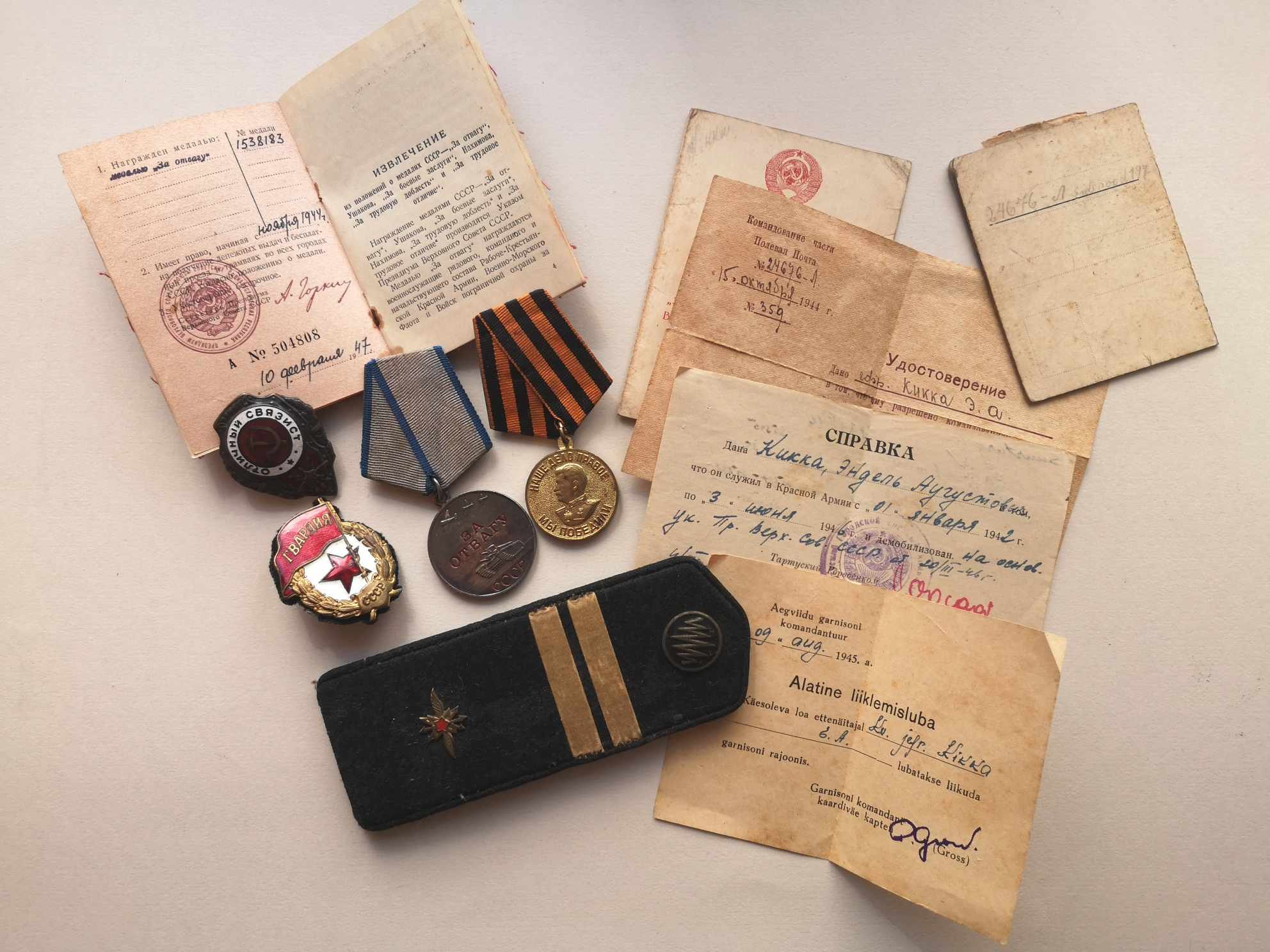 Huvitav komplekt just selle pärast, et ta oli üks nendest meestest, kes läks Eesti ajal ajateenistusse ja tegi kogu sõja kaasa. Noorte ajal oli Sõjaministeeriumis ja edasi läks Sidepataljoni. Ajateenistuse aegne Sidepataljoni trafarett on hiljem pandud paguni külge.
